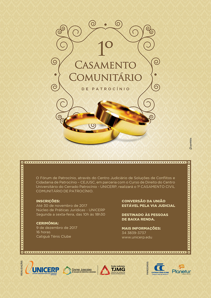 Acontecerá em 9 de dezembro de 2017, a partir das 16h, o 1º Casamento Civil Comunitário de Patrocínio. A realização é uma parceria entre o Fórum de Patrocínio e o curso de Direito do UNICERP – Centro Universitário do Cerrado Patrocínio. O evento será realizado através do Centro Judiciário de Soluções de Conflitos e Cidadania (CEJUSC). A cerimônia será realizada no ginásio do Catiguá Tênis Clube.