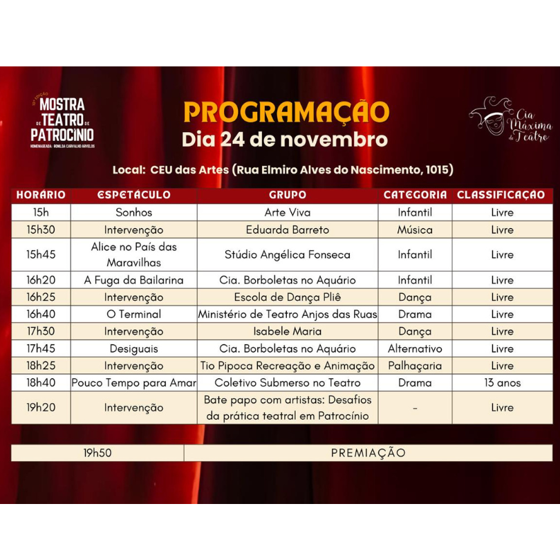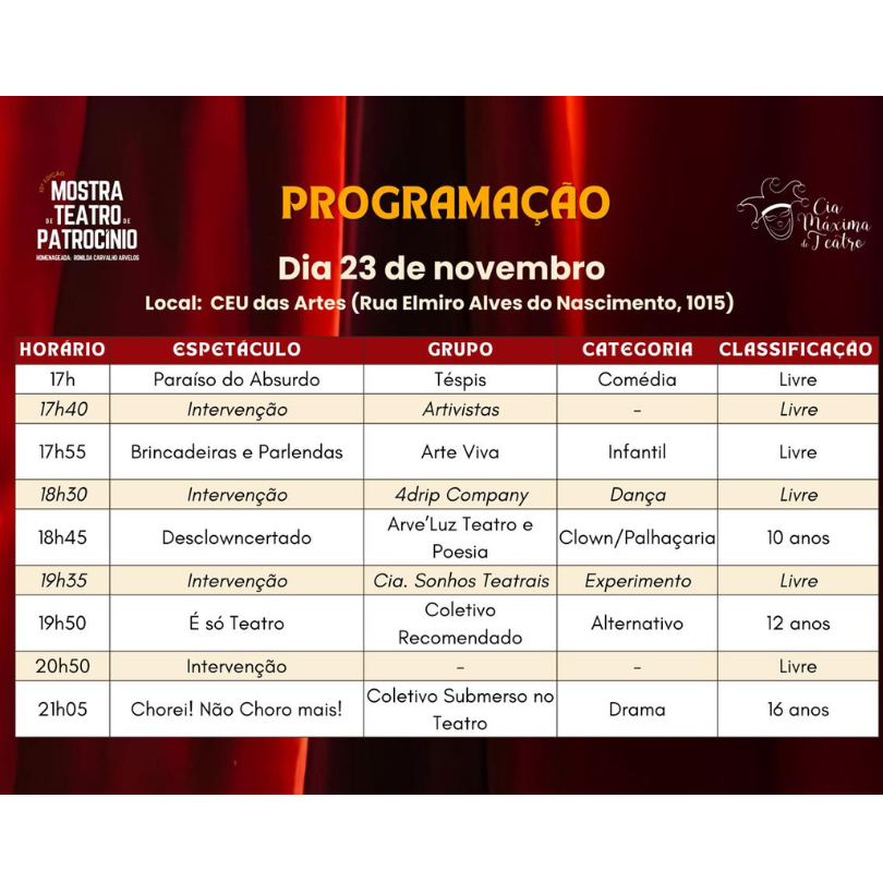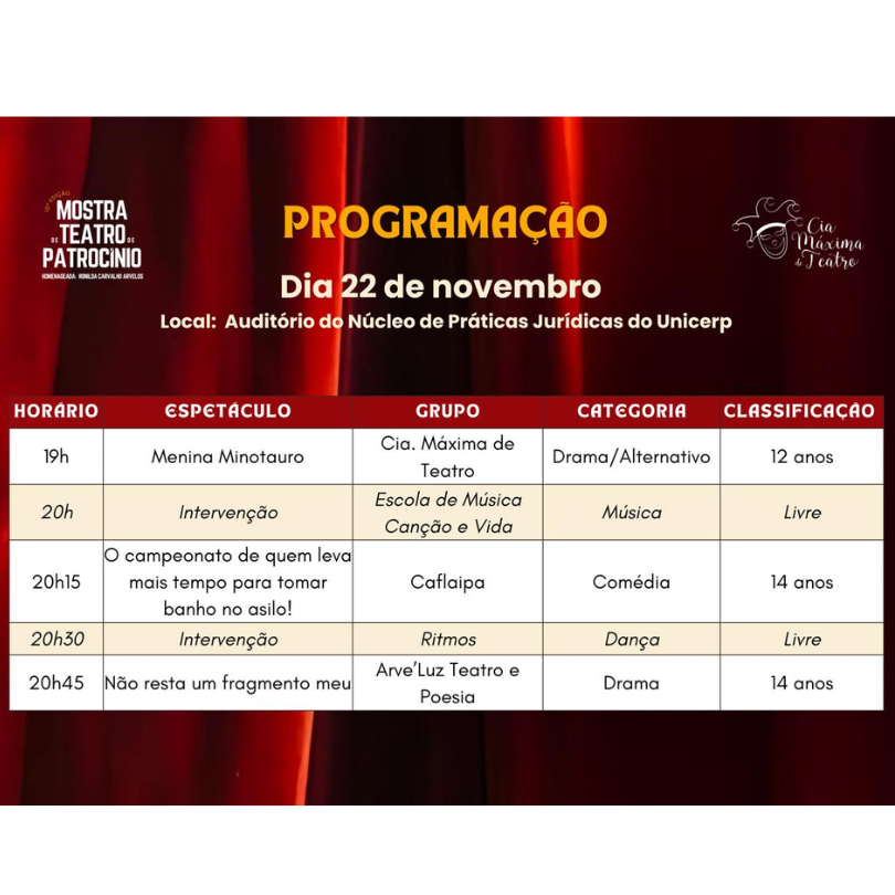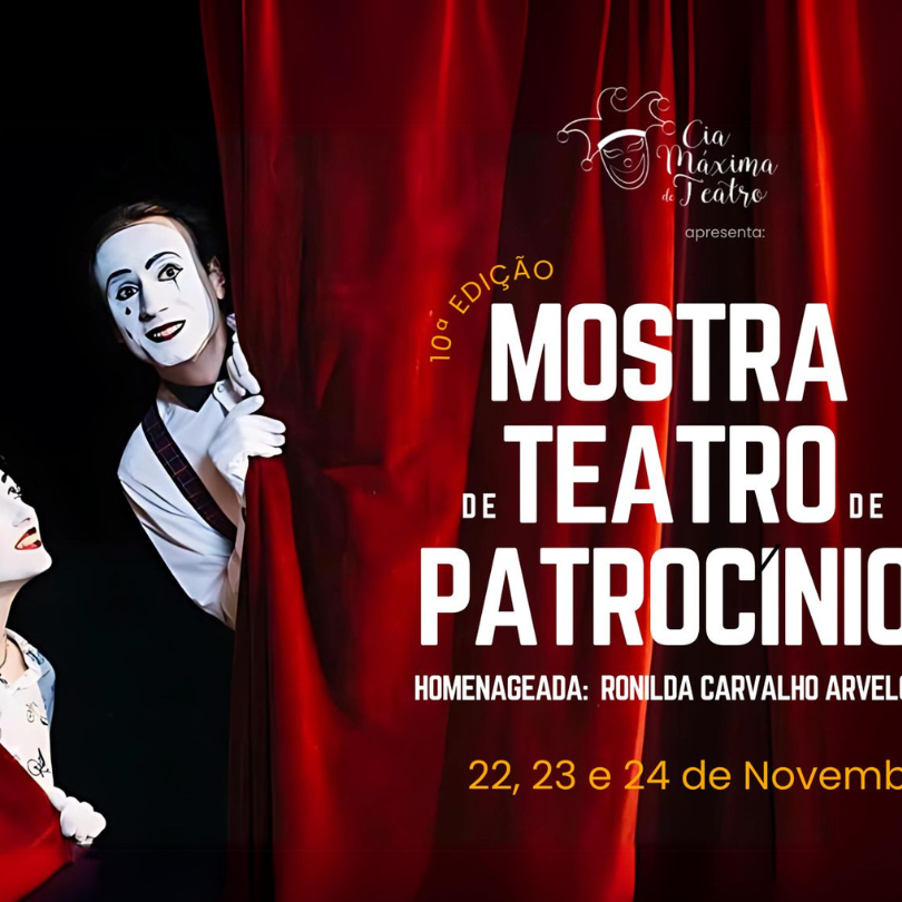 Nos próximos dias 22, 23 e 24 de novembro, Patrocínio será palco de uma das mais tradicionais celebrações culturais da cidade: a 10ª Edição da Mostra de Teatro. O evento, realizado pela Cia Máxima de Teatro, conta com o apoio institucional do Unicerp e com a participação de diversos grupos artísticos locais, promovendo uma vasta programação que une teatro, música, dança e outras manifestações culturais.