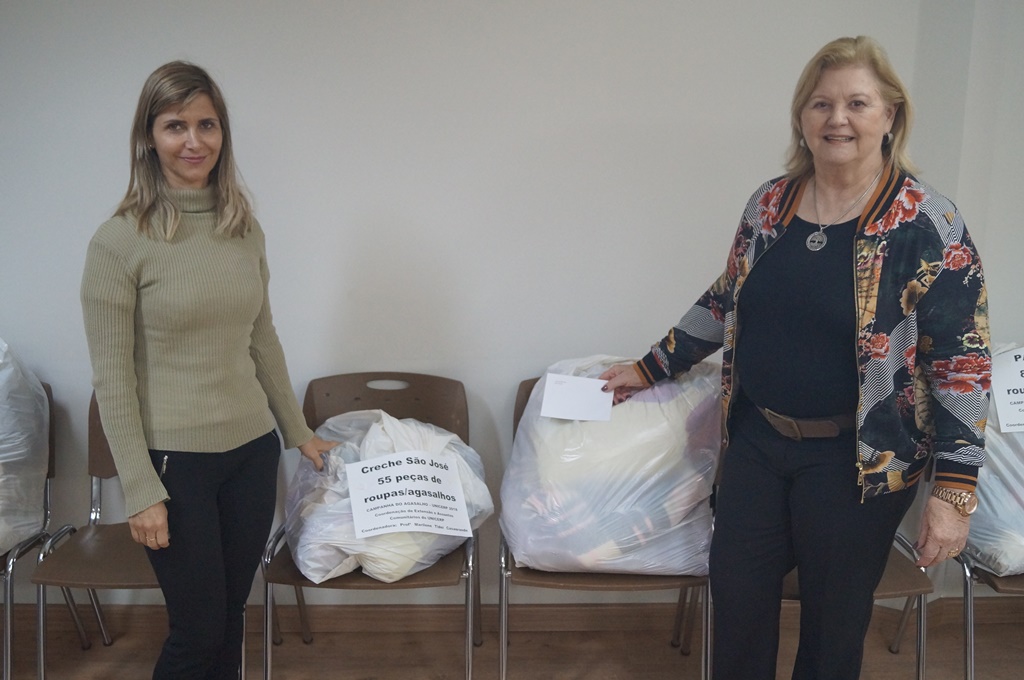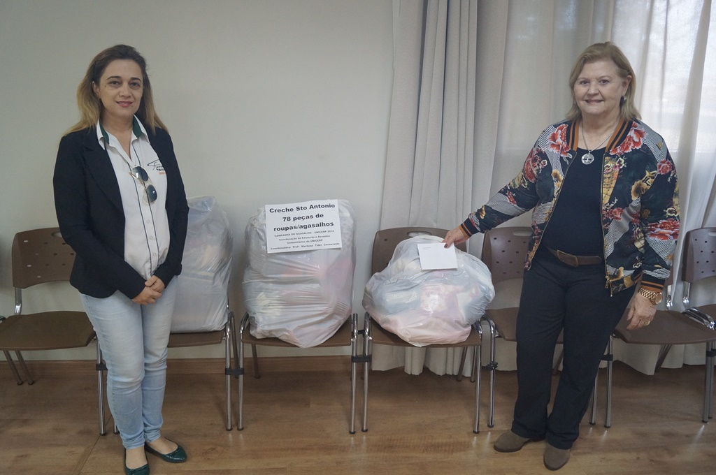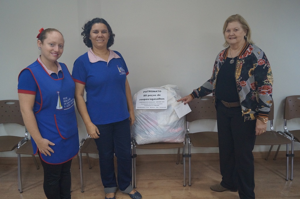 As doações foram distribuídas de acordo com o tipo de público e número de pessoas atendidas por cada entidade. A entrega foi feita pela Prof.ª Ma. Marilene Tidei Casagrande, coordenadora de Extensão e Assuntos Comunitários do UNICERP.