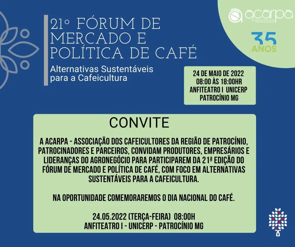 A ACARPA realizará no dia 24 de maio o 21º Fórum de Mercado e Política de Café com foco em Alternativas Sustentáveis para a Cafeicultura e também será comemorado o Dia Nacional do Café.