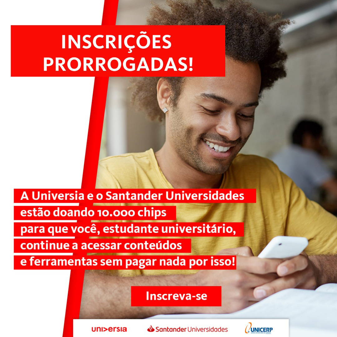 Você ainda pode concorrer a um chip de internet de alta velocidade. A Universia e o Santander Universidades, parceiras do UNICERP, estão com inscrições do Programa de Acessibilidade Digital Via Celular abertas até o dia 11 de fevereiro, quinta-feira. O programa busca facilitar o acesso à internet aos alunos com maior vulnerabilidade financeira. As inscrições poderão ser feitas até o dia 11 de fevereiro.