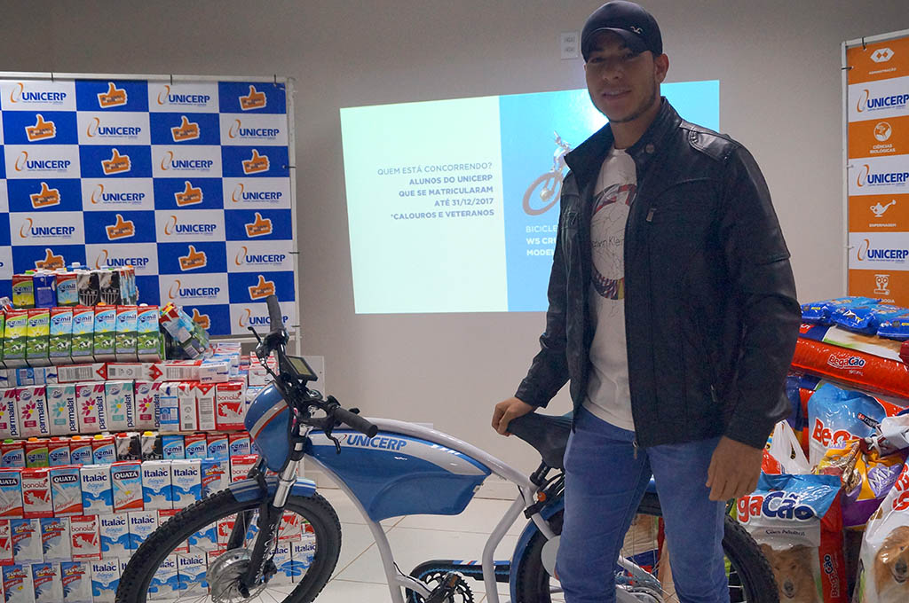 A FUNCECP sorteou uma bicicleta elétrica personalizada entre os alunos do UNICERP que efetivaram a matrícula até 31 de dezembro de 2017. O vencedor foi o aluno do 1º período do curso de Agronomia Gabriel Henrique Alves. O estudante recebeu a e-bike na última segunda-feira, 14, na sede Fundação Comunitária Educacional e Cultural de Patrocínio. O sorteio foi realizado no dia 10 de maio, na Praça de Alimentação do Centro Universitário do Cerrado Patrocínio.
