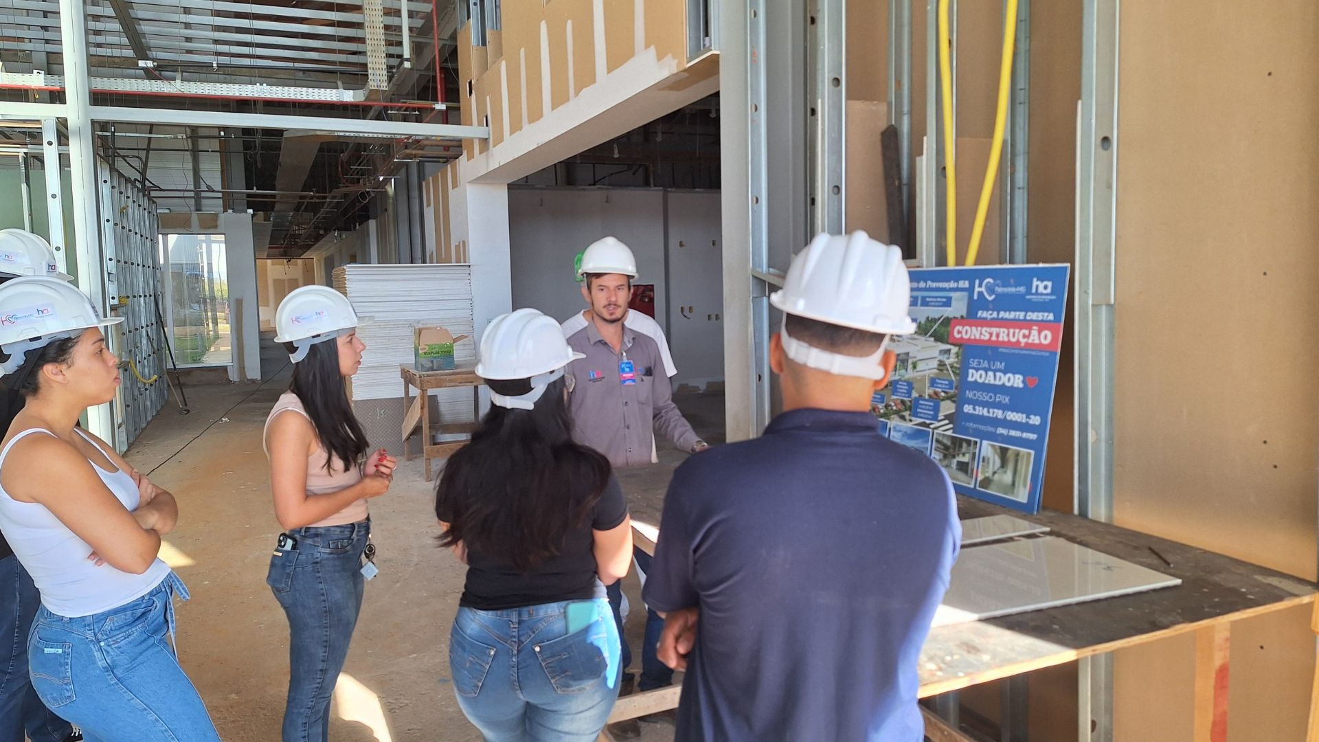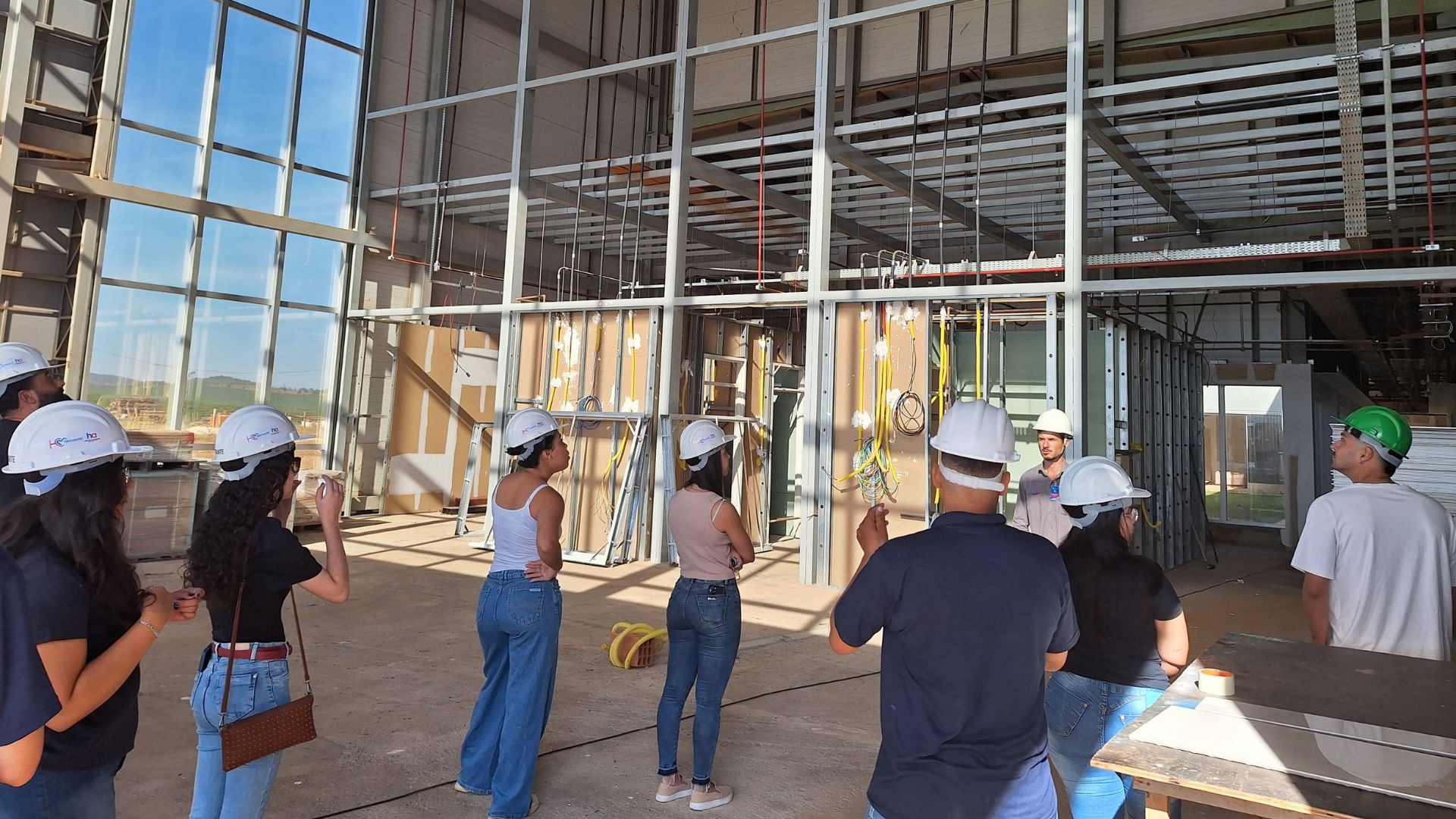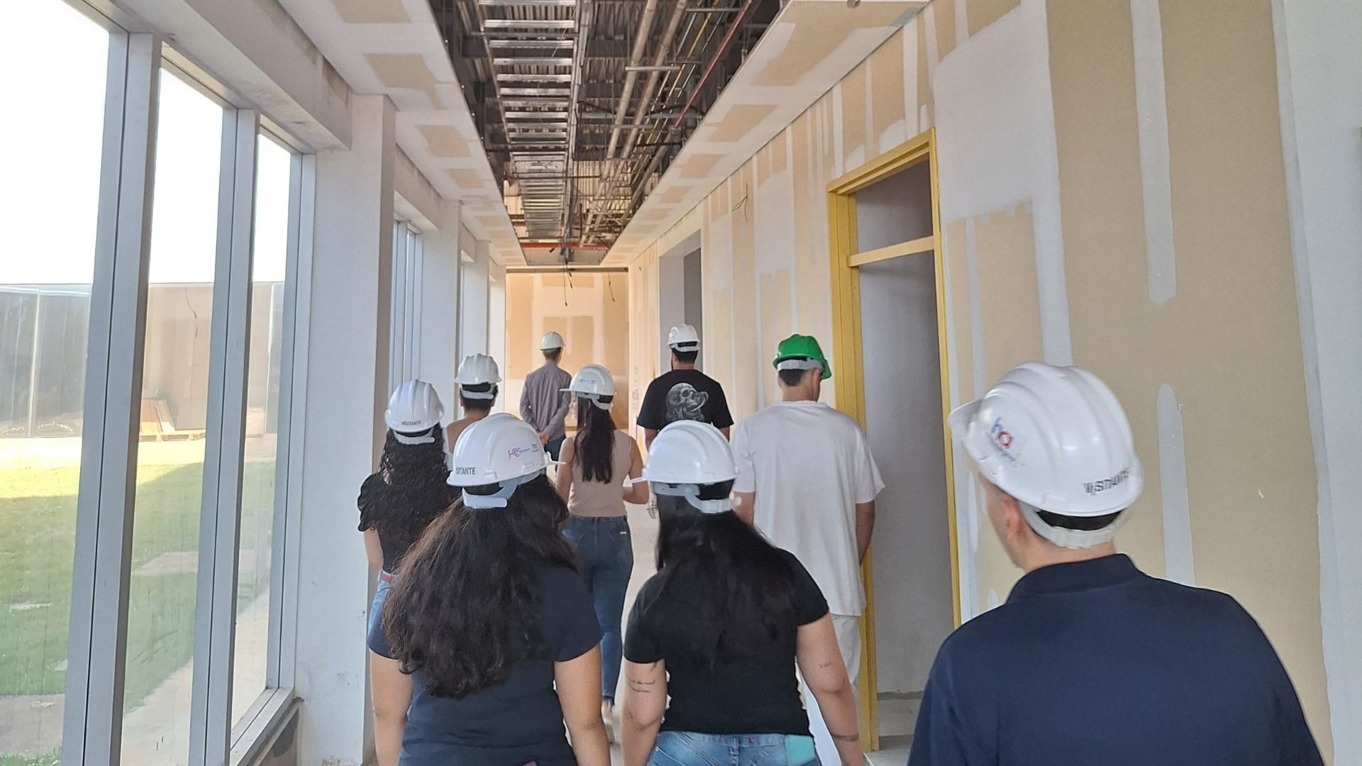 Recebidos pelo engenheiro responsável, Mateus Mallon Ferreira, os estudantes vivenciaram uma experiência de grande aprendizado técnico. Eles puderam conhecer as técnicas construtivas e os materiais atualmente utilizados, específicos e recomendados para obras hospitalares. Também tiveram a oportunidade de analisar os projetos em planta de cada setor — em construção e ainda a construir.
