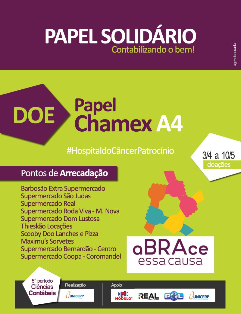 O 5º período do curso de Ciências Contábeis o UNICERP está realizando o projeto “Papel solidário, contabilizando o bem” em prol do Hospital do Câncer de Patrocínio Dr. José Figueiredo. O grupo está arrecadando papel sulfite no formato A4. A doação pode ser feita até o dia 10 de maio.