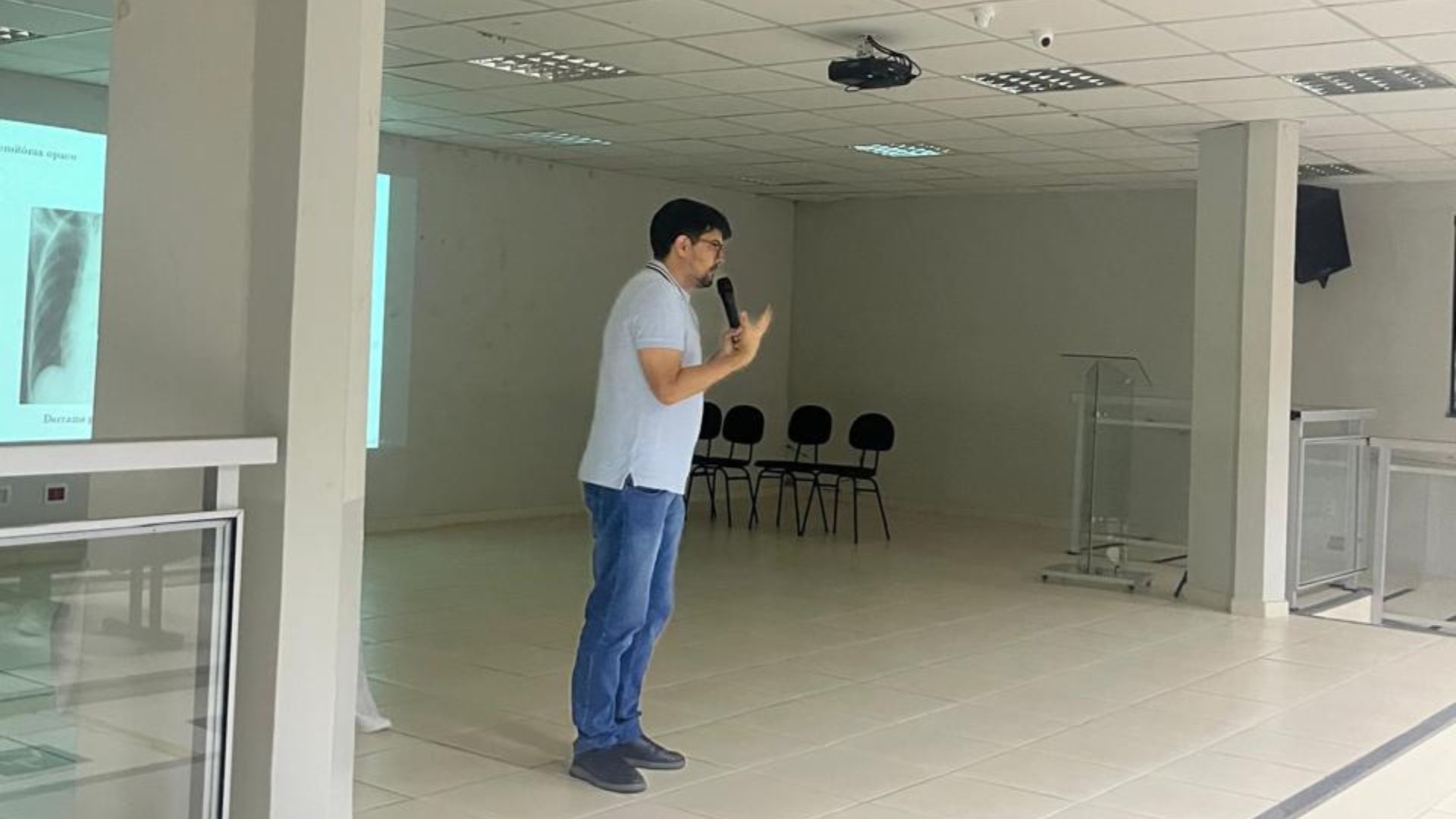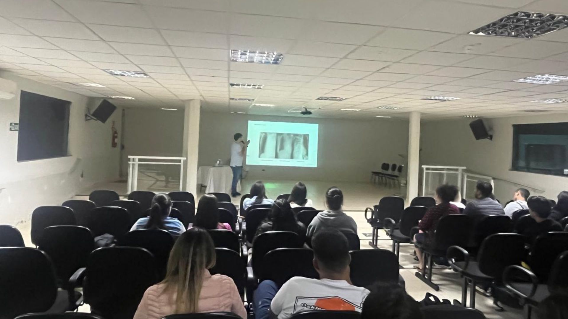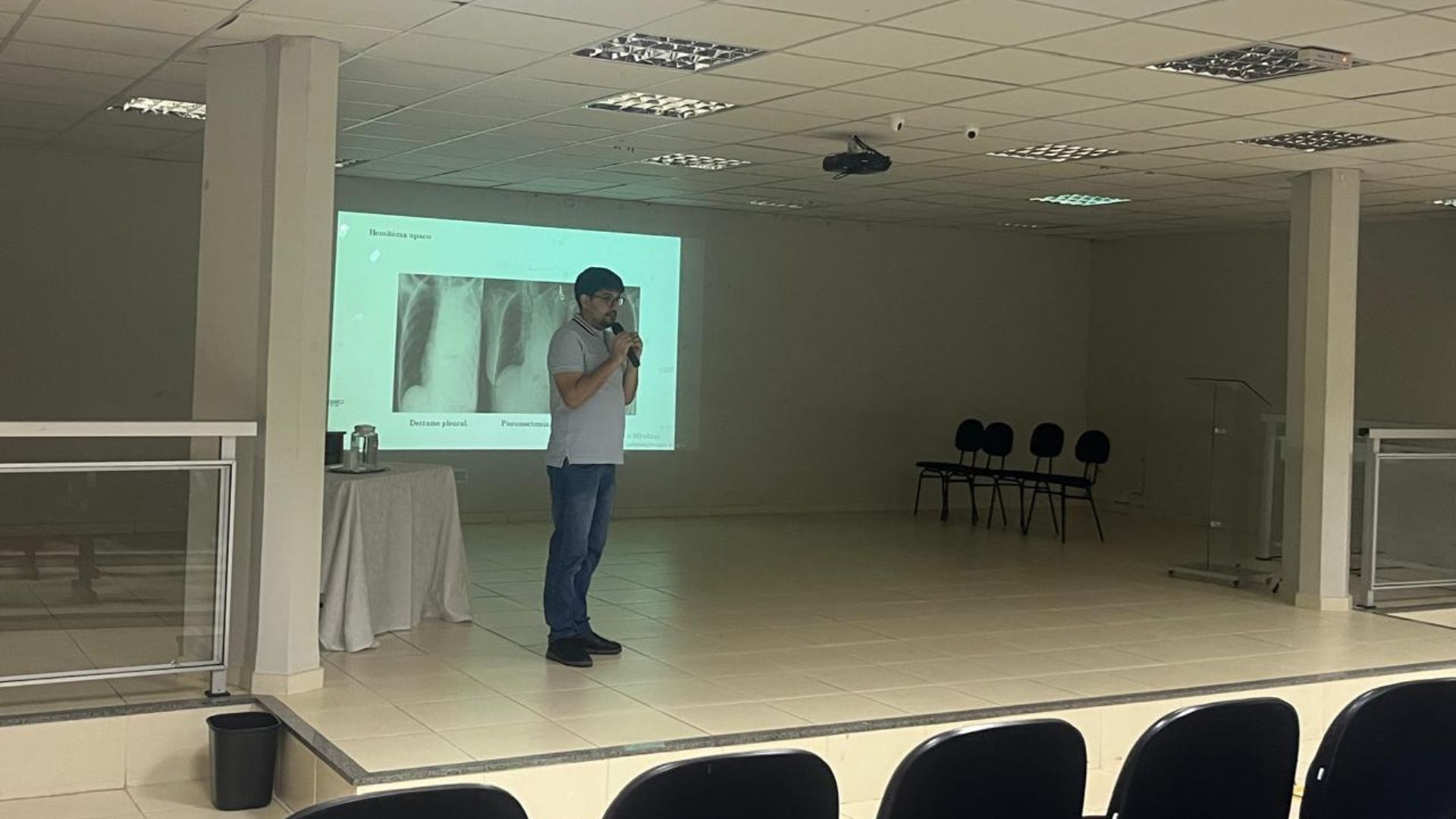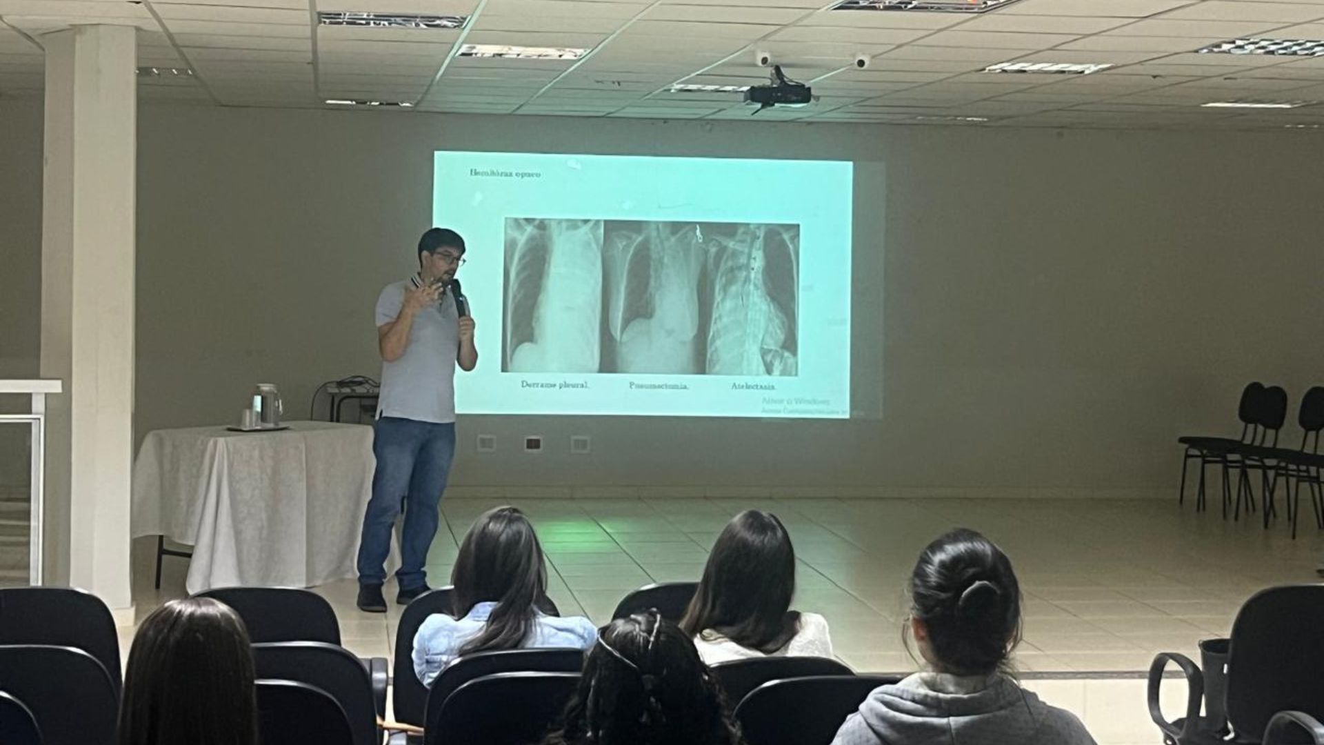 Durante a atividade, o Dr. Leandro compartilhou seus conhecimentos e experiências na área, promovendo uma discussão aprofundada sobre imagens radiológicas, sinais clínicos e condutas frente a diferentes doenças pulmonares e torácicas. A capacitação proporcionou uma oportunidade valiosa de aprendizado interdisciplinar, contribuindo para a formação técnica e humanizada dos futuros profissionais da saúde.