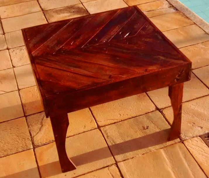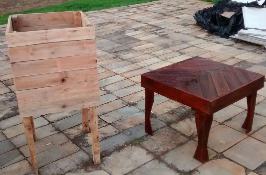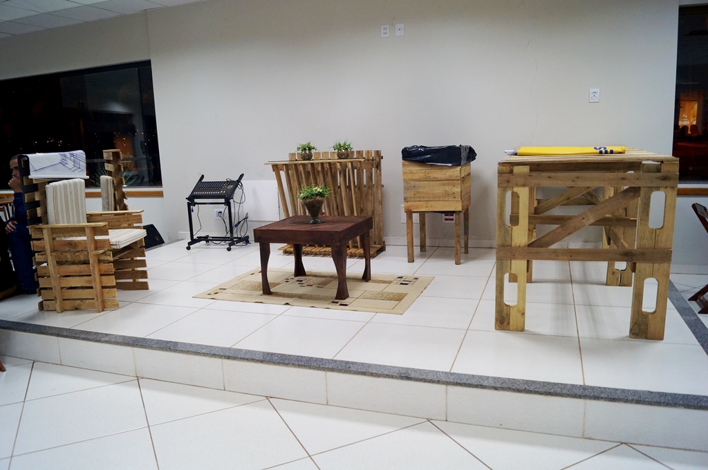 Foram desenvolvidos os móveis: bancada de feira, lixeira, mesa de centro, aparador e poltronas. O mobiliário está exposto na Praça de Alimentação do UNICERP.