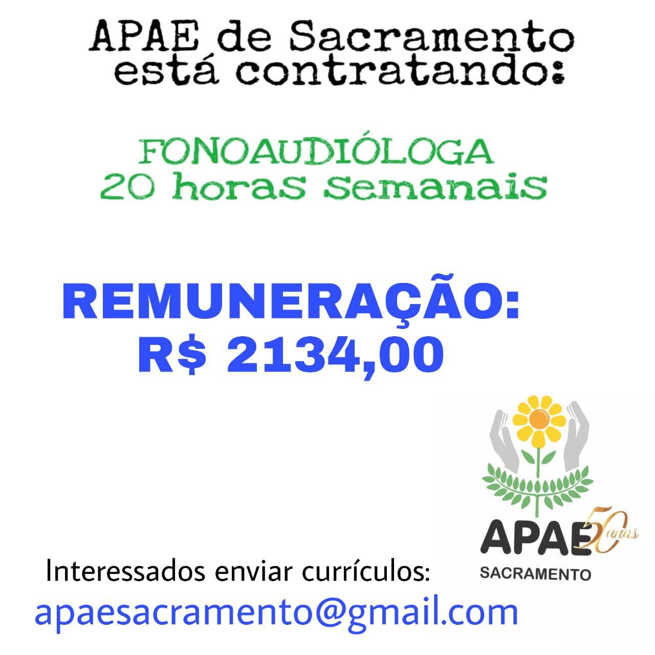 A APAE de Sacramento está contratando Fonoaudióloga para trabalhar 20h semanais com remuneração de RS 2.134,00.