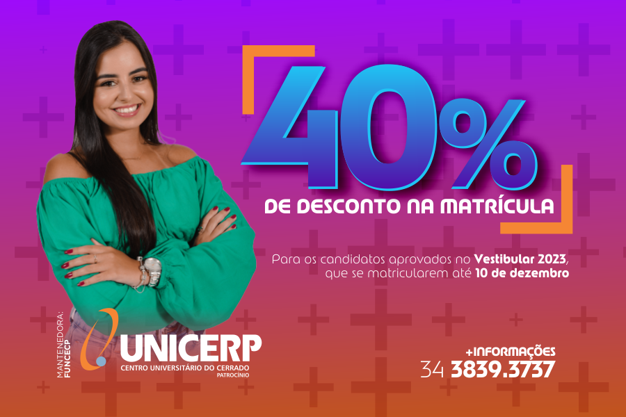 Os candidatos aprovados no Vestibular 2023 e que ainda não se matricularam, podem confirmar sua matrícula até o dia 10 de dezembro com 40% de desconto. O futuro aluno deve procurar a Secretaria Acadêmica e o Setor Financeiro para garantir sua vaga em um dos cursos do UNICERP no próximo ano.
