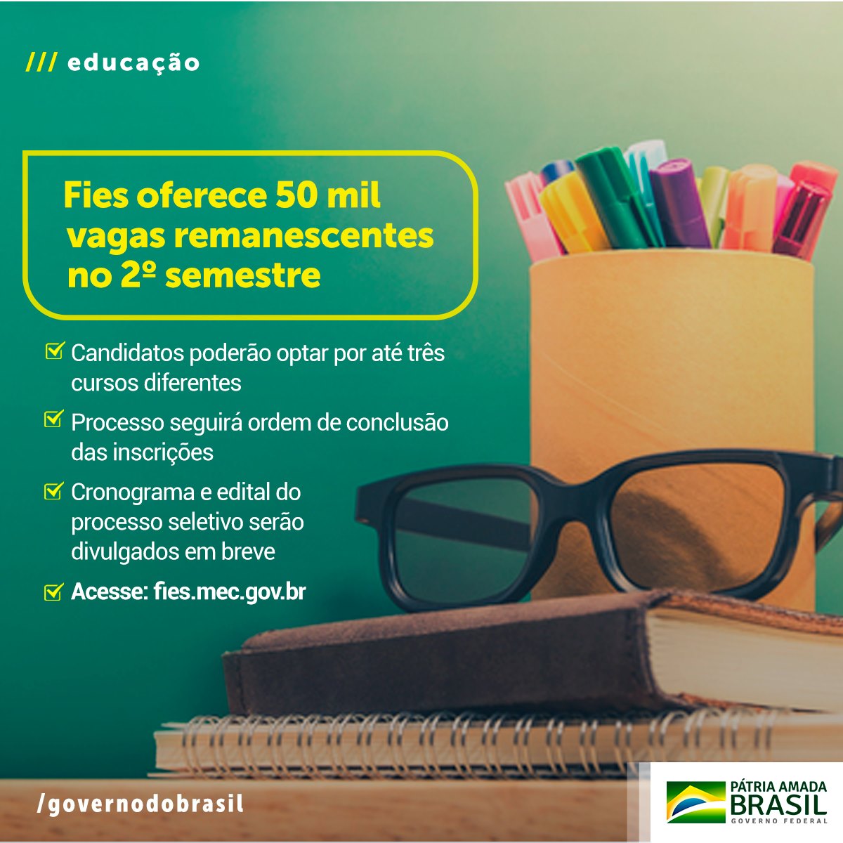 O Fundo de Financiamento Estudantil (Fies), que financia estudos em cursos superiores, abrirá um processo para o preenchimento de cerca de 50 mil vagas remanescentes, ou seja, aquelas não preenchidas nas edições dos processos seletivos regulares de 2020. Cada candidato poderá concorrer a uma vaga, podendo optar por até três cursos diferentes.