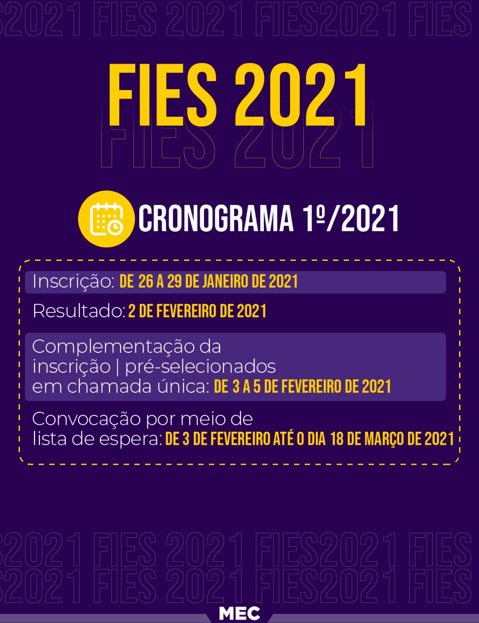No segundo card, há o seguinte texto: “Fies 2021. Cronograma 1/2021. Inscrição: de 26 a 29 de janeiro de 2021. Resultado 2 de fevereiro de 2021. Complementação da inscrição – pré-selecionados em chamada única: de 3 a 5 de fevereiro de 2021. Convocação por meio de lista de espera: de 3 de fevereiro até o dia 18 de março de 2021”.”