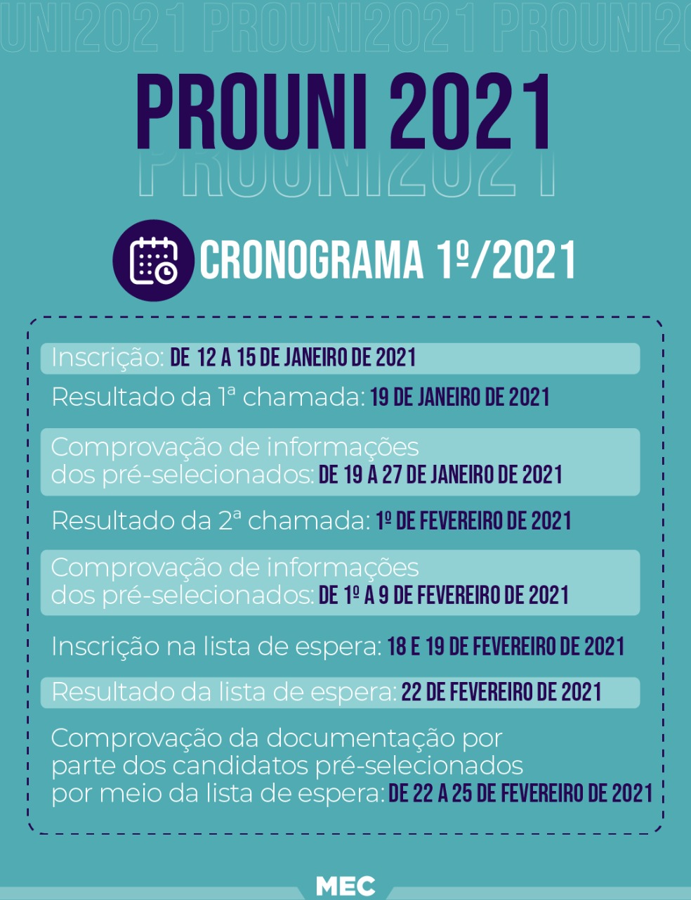 #PraCegoVer: No primeiro card, há o seguinte texto: “Prouni 2021. Cronograma 1/2021. Inscrição: de 12 a 15 de janeiro de 2021. Resultado da 1ª chamada: 19 de janeiro de 2021. Comprovação de informações dos pré-selecionados: de 19 a 27 de janeiro de 2021. Resultado da 2ª chamada: 1º de fevereiro de 2021. Comprovação de informações dos pré-selecionados: de 1º a 9 de fevereiro de 2021. Inscrição na lista de espera: de 18 e 19 de fevereiro de 2021. Resultado da lista de espera: 22 de fevereiro de 2021. Comprovação da documentação por parte dos candidatos pré-selecionados por meio da lista de espera: de 22 a 25 de fevereiro de 2021”.”