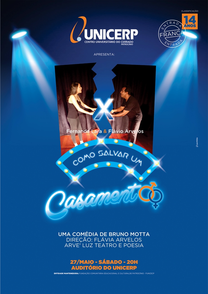 O UNICERP Cultural receberá no próximo sábado, dia 27, o espetáculo teatral “Como salvar um casamento”, a partir das 20h. A apresentação será realizada no Auditório II do Núcleo de Práticas Jurídicas, Administrativas e Contábeis do Centro Universitário do Cerrado Patrocínio.