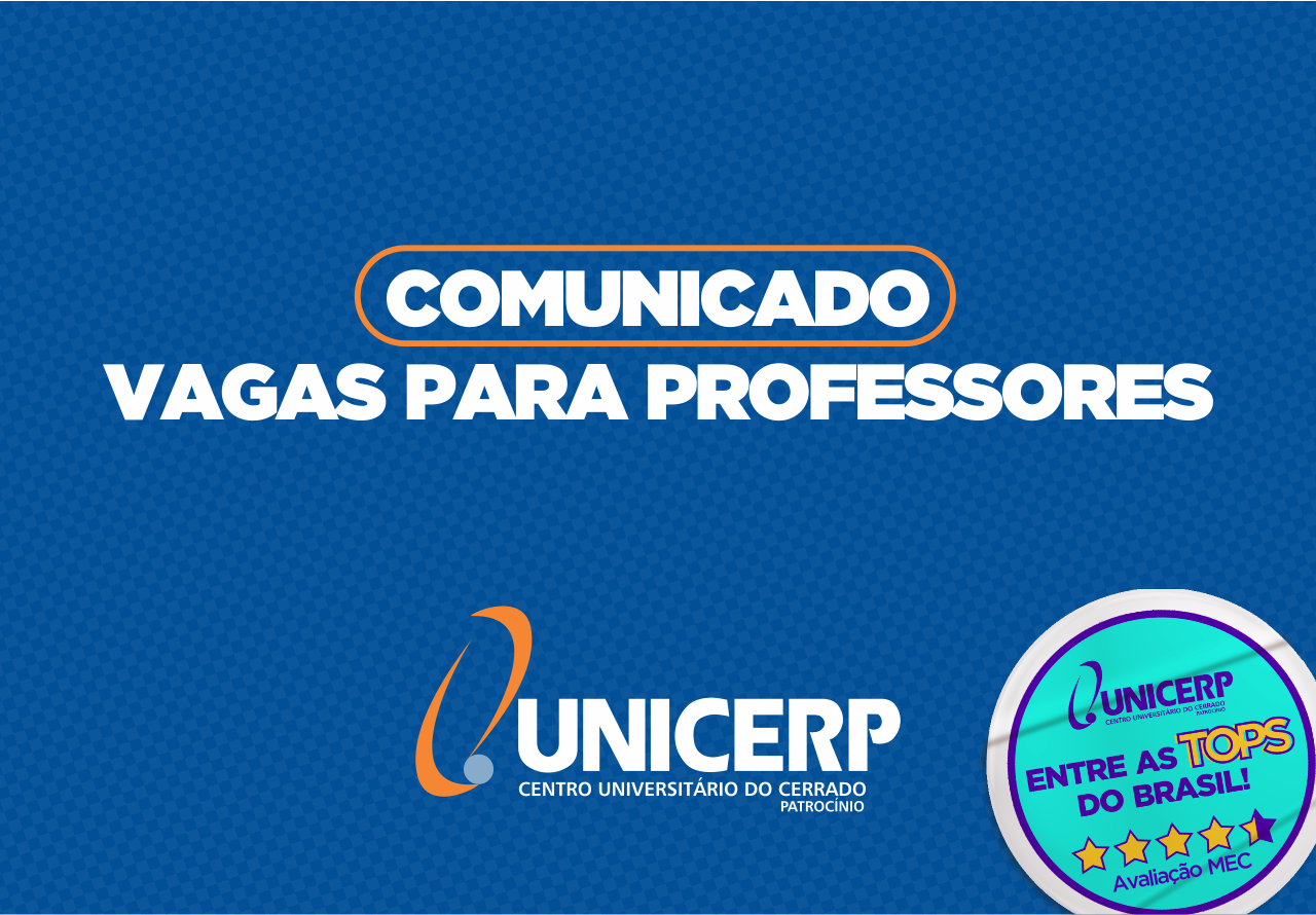 A Reitora Profª Mª Iêda Pereira de Magalhães Martins do Centro Universitário do Cerrado Patrocínio - UNICERP torna público o recebimento de currículos destinados à contratação de professores, a partir do 22-07-2024, para as disciplinas constantes do quadro abaixo: