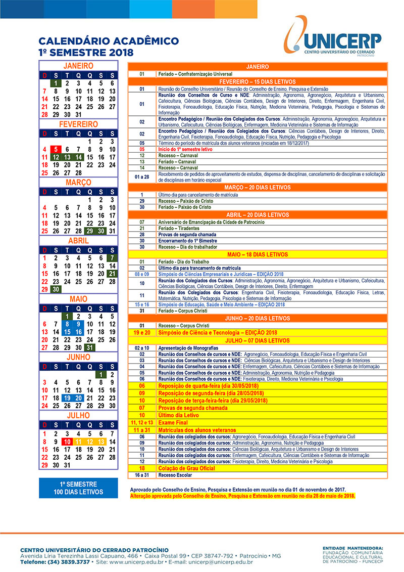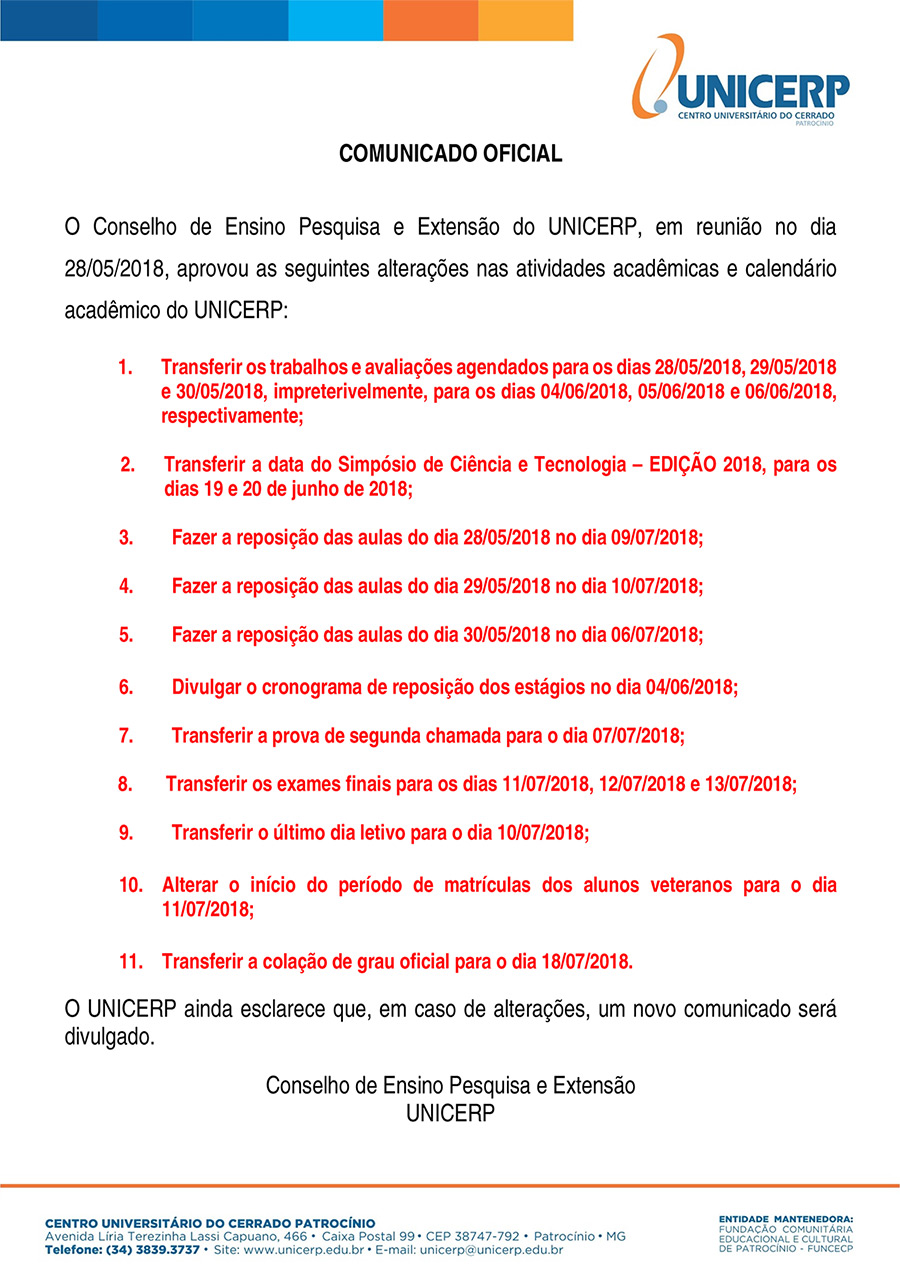 O Conselho de Ensino, Pesquisa e Extensão do UNICERP, em reunião no dia 28/05/2018, aprovou as seguintes alterações nas atividades acadêmicas e calendário acadêmico do UNICERP: