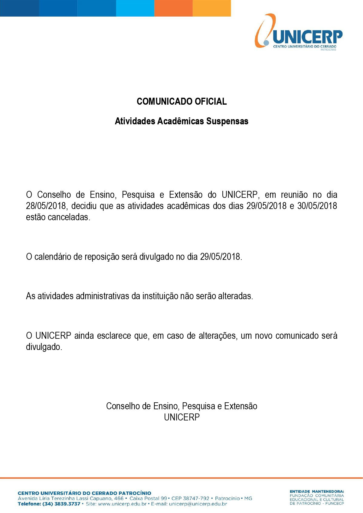 O Conselho de Ensino, Pesquisa e Extensão do UNICERP, em reunião no dia 28/05/2018, decidiu que as atividades acadêmicas dos dias 29/05/2018 e 30/05/2018 estão canceladas.