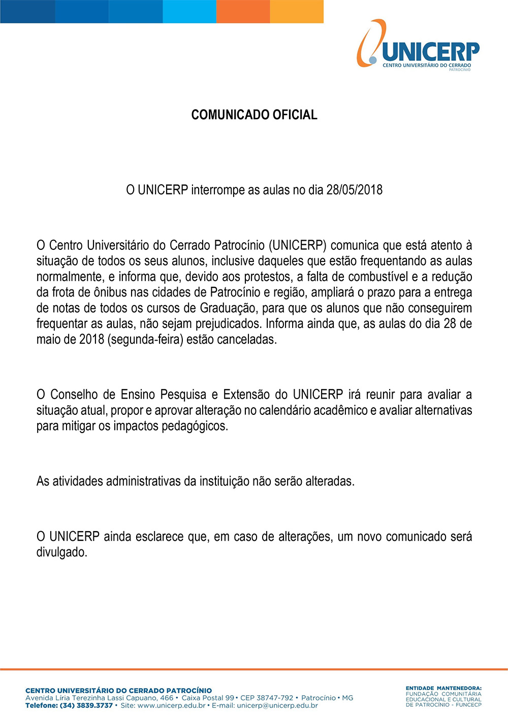 O Centro Universitário do Cerrado Patrocínio (UNICERP) comunica que está atento à situação de todos os seus alunos, inclusive daqueles que estão frequentando as aulas normalmente, e informa que, devido aos protestos, a falta de combustível e a redução da frota de ônibus nas cidades de Patrocínio e região, ampliará o prazo para a entrega de notas de todos os cursos de Graduação, para que os alunos que não conseguirem frequentar as aulas, não sejam prejudicados. Informa ainda que, as aulas do dia 28 de maio de 2018 (segunda-feira) estão canceladas.