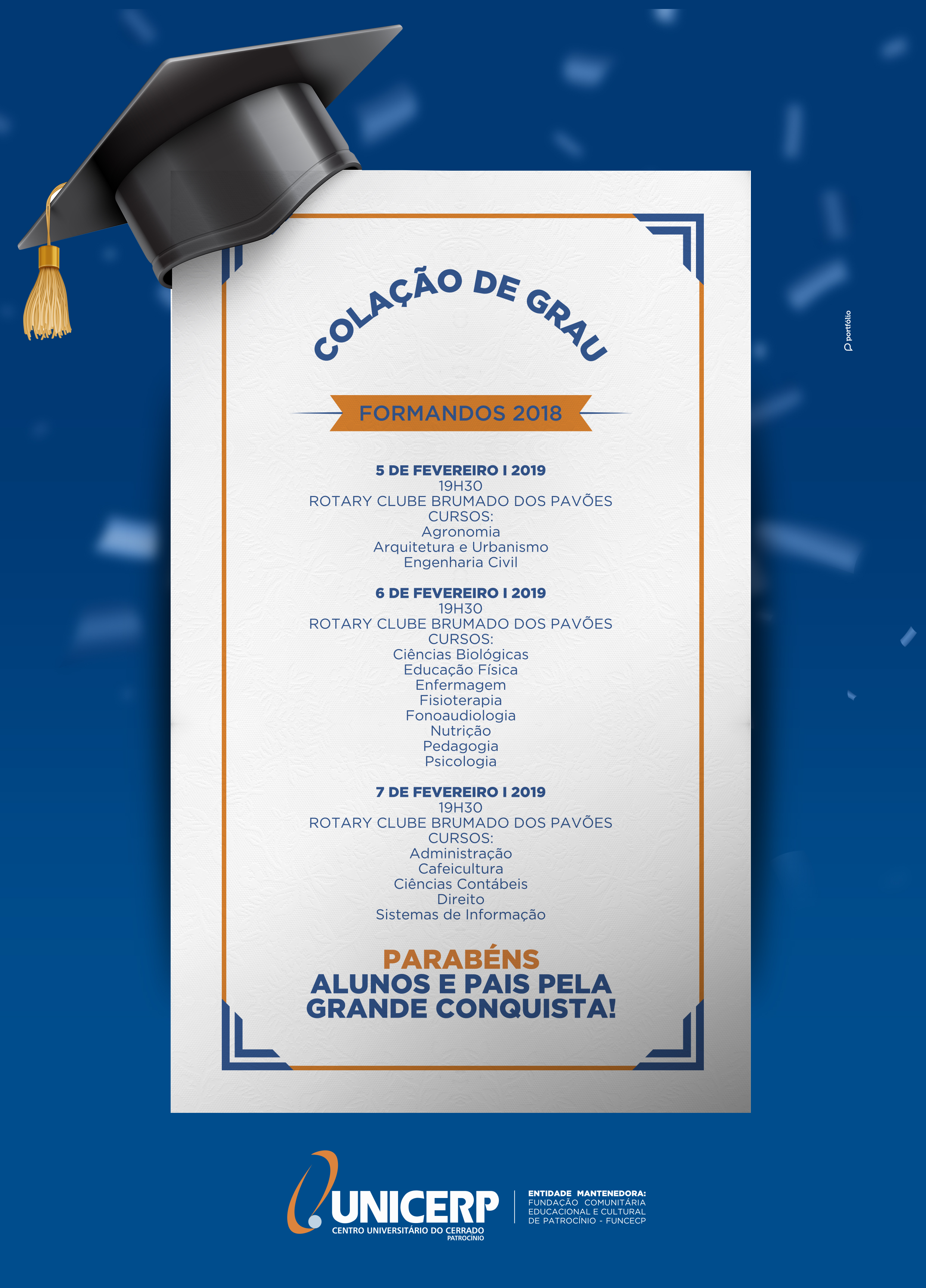 O UNICERP – Centro Universitário do Cerrado Patrocínio – convida toda a comunidade para a Colação de Grau dos cursos de graduação. As cerimônias acontecerão de 5 a 7 de fevereiro, a partir das 19h30, no Rotary Clube Brumado dos Pavões.