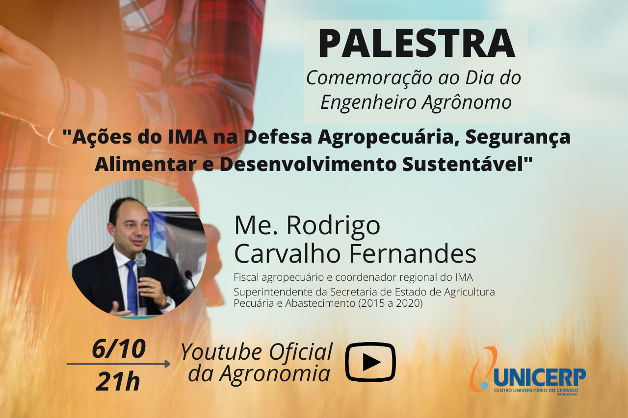A apresentação terá início às 21h, com transmissão no canal da Agronomia UNICERP no Youtube. A palestra é em comemoração ao Dia do Engenheiro Agrônomo, celebrada em 12 de outubro.