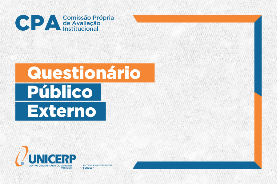 A sua opinião pode influenciar diretamente nos serviços, infraestrutura e melhorias de ensino do Centro Universitário do Cerrado Patrocínio – UNICERP, por isso a Comissão Própria de Avaliação (CPA) do UNICERP, disponibiliza esse ano esse questionário para o público externo avaliar a importância do Ensino Superior e a opinião que tem sobre o UNICERP.