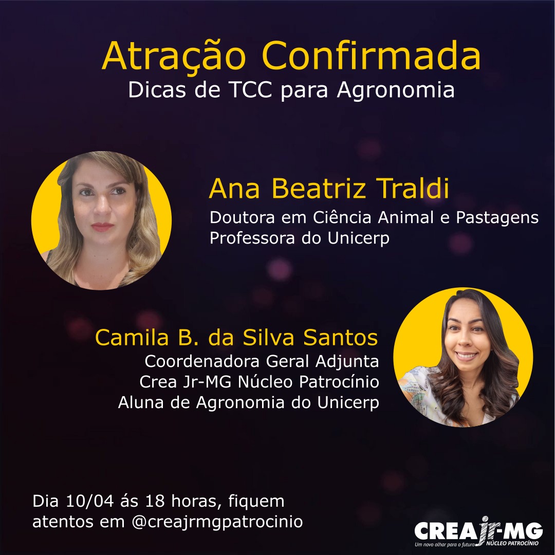 Teremos a presença da professora do UNICERP, Ana Beatriz Traldi – Doutora em Ciência Animal e Pastagens e que ministra a disciplina de Trabalho de Conclusão de Cursos nos cursos de Agronomia, Tecnologia em Cafeicultura, Medicina Veterinária e na Escola Agrotécnica Sérgio de Freitas Pacheco e da aluna de Agronomia do UNICERP, Camila Barbosa da Silva Santos, também Coordenadora Geral Adjunta do Crea Jr-MG Núcleo Patrocínio.