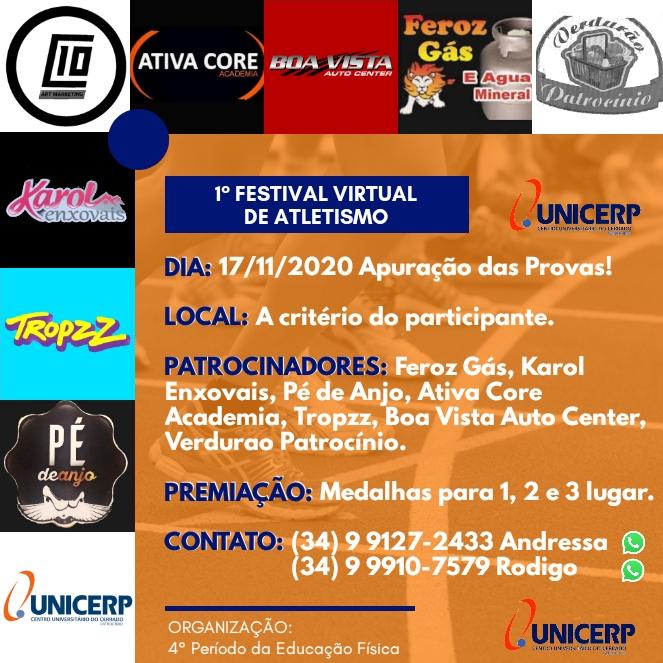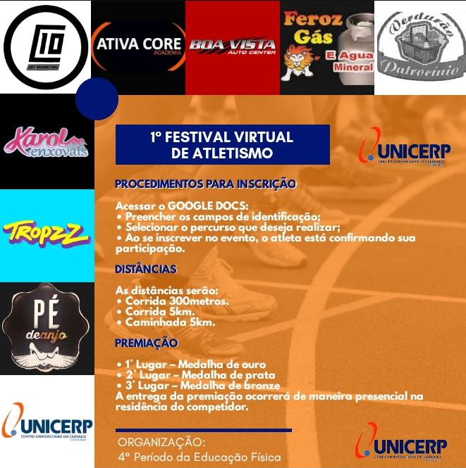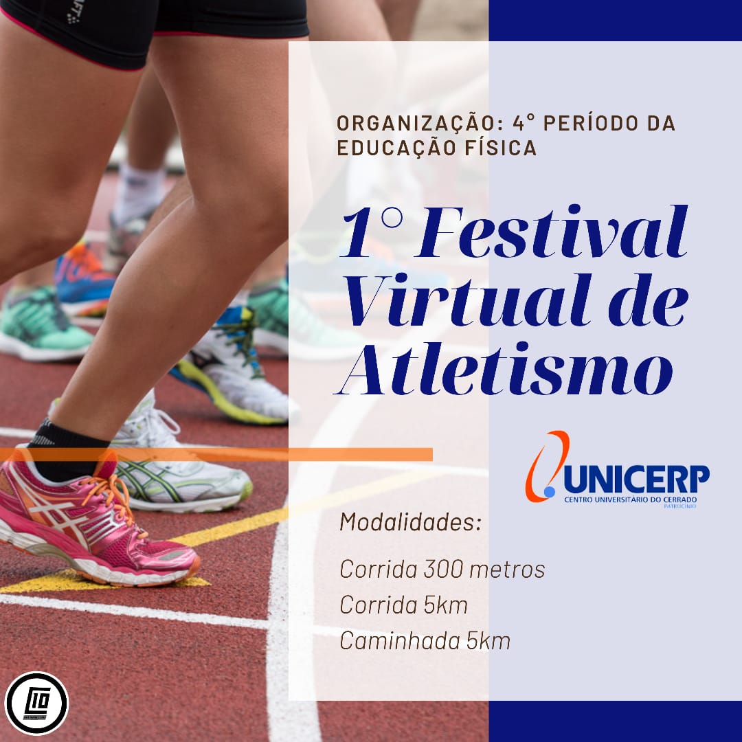 Os alunos do 4º período do curso de Educação Física do UNICERP estão promovendo o I Festival Virtual de Atletismo. O evento acontece entre os dias 14 a 17 de novembro, com três modalidades: percurso de 300m (corrida), 5km (corrida) e 5km (caminhada).