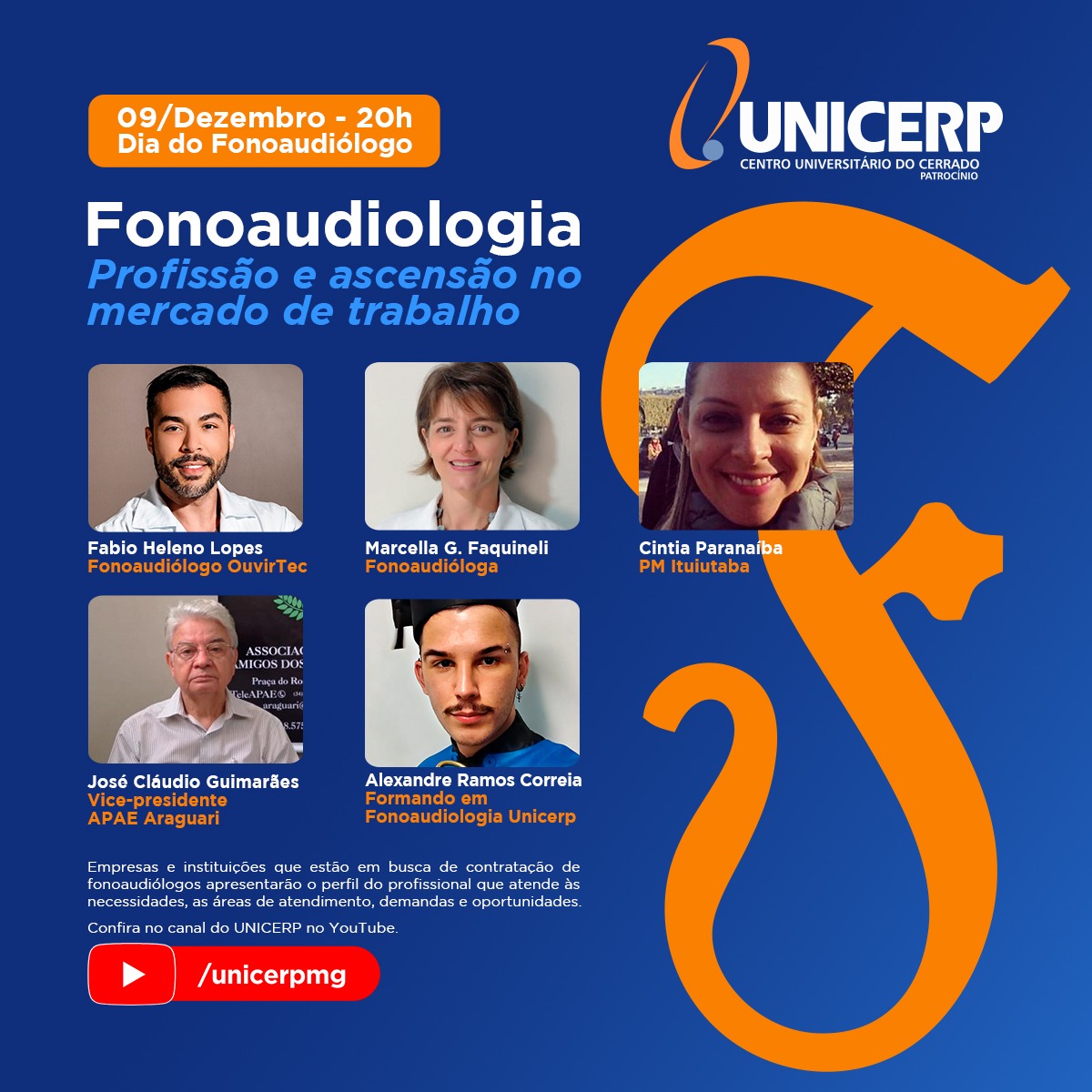 O curso de Fonoaudiologia do UNICERP, em comemoração ao Dia do Fonoaudiólogo, realizará no dia 09/12/2021, às 20h, um bate papo com o tema: “Fonoaudiologia: Profissão e ascensão no mercado de trabalho”. O evento será on-line e transmitido pelo Canal Oficial do UNICERP no Youtube.