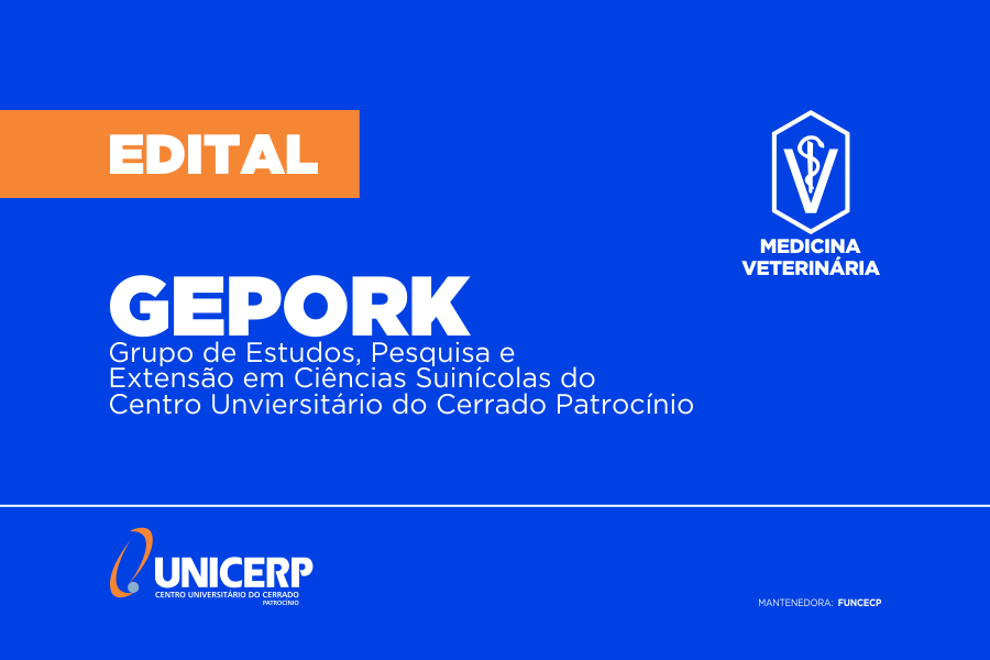O curso de Medicina Veterinária torna público edital de seleção para o GEPORK (Grupo de Estudos, Pesquisa e Extensão em Ciências Suinícolas do Centro Unviersitário do Cerrado Patrocínio). As inscrições para o Processo Seletivo do GEPORK estarão abertas no período de 14 a 24 de março de 2023. A prova acontecerá no dia 28 de março. Os resultados serão divulgados no dia 29 de março de 2023.