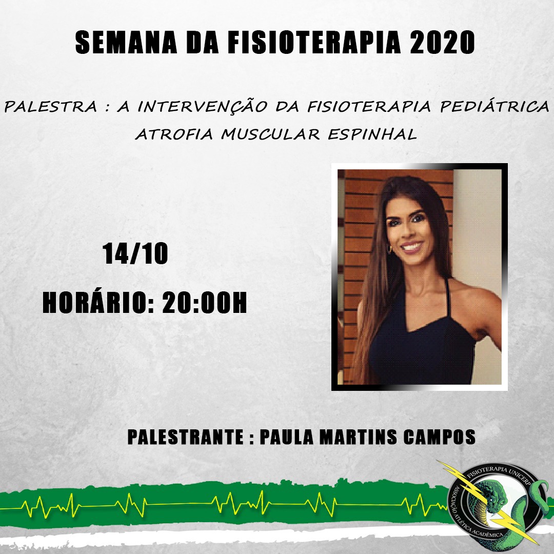 A primeira palestra será ministrada pelo fisioterapeuta Leonardo Tavares, sobre “Fisioterapia na UTI Covid”, às 19h. Dando prosseguimento, a fisioterapeuta e egressa do UNICERP, Paula Martins Campos, discorrerá sobre “A intervenção da Fisioterapia Pediátrica na AME (atrofia muscular espinhal)”.