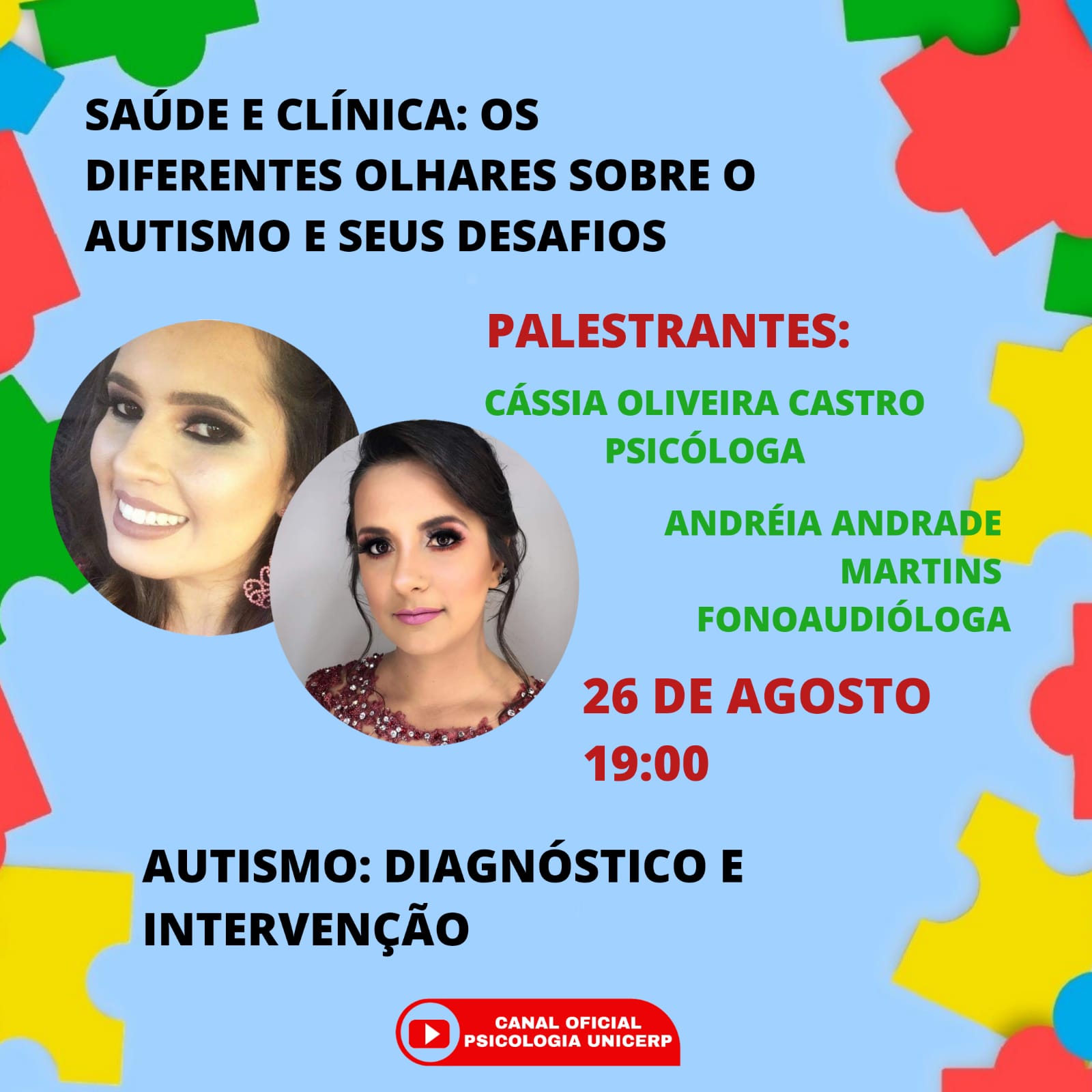 Na quarta-feira, 26, acontecerão duas a palestras sobre o tema “Saúde e Clínica: os diferentes olhares sobre o autismo e seus desafios”, com a psicóloga Cássia Oliveira Castro, a fonoaudióloga Andréia Andrade Martins e o psicólogo Bruno Magalhães Gontijo.