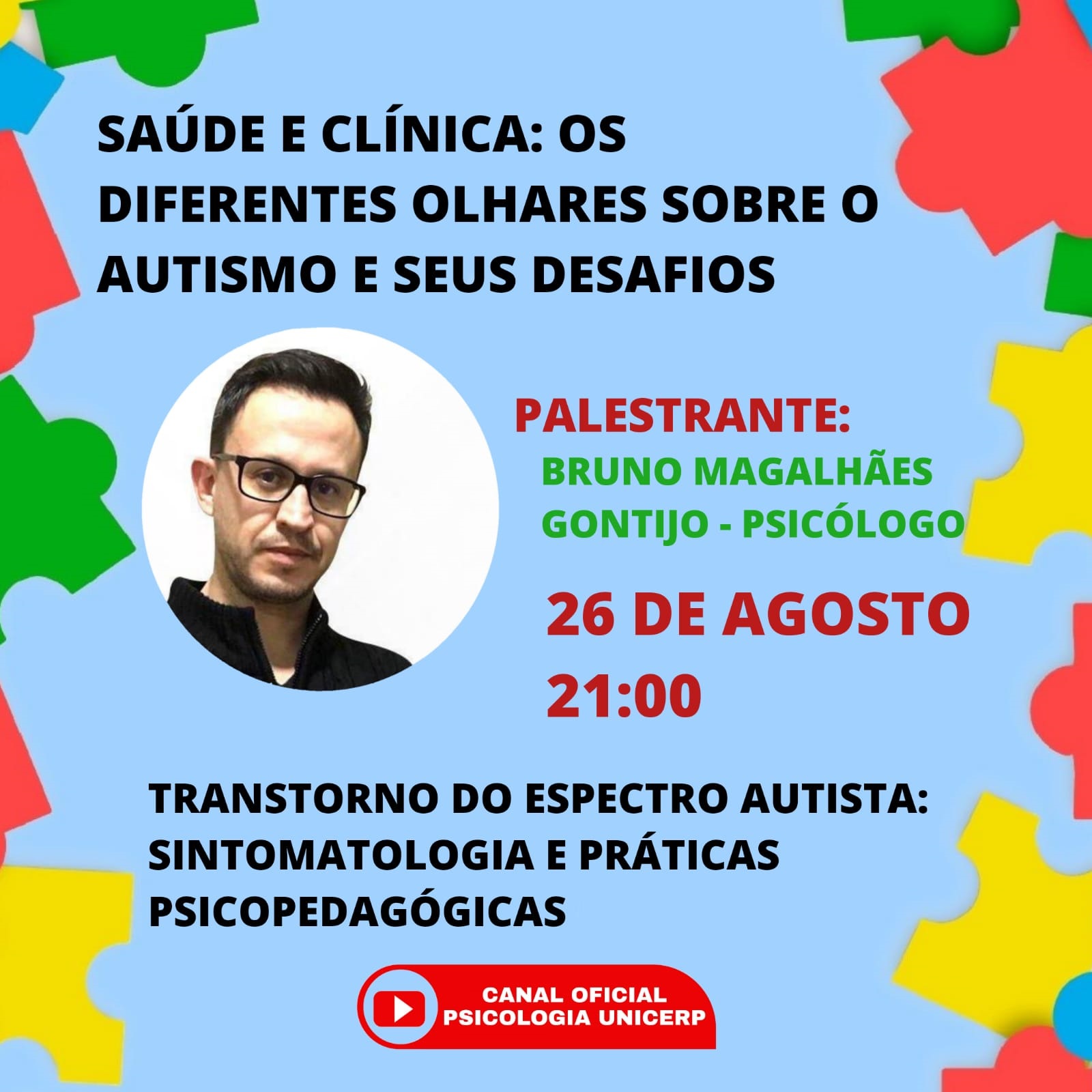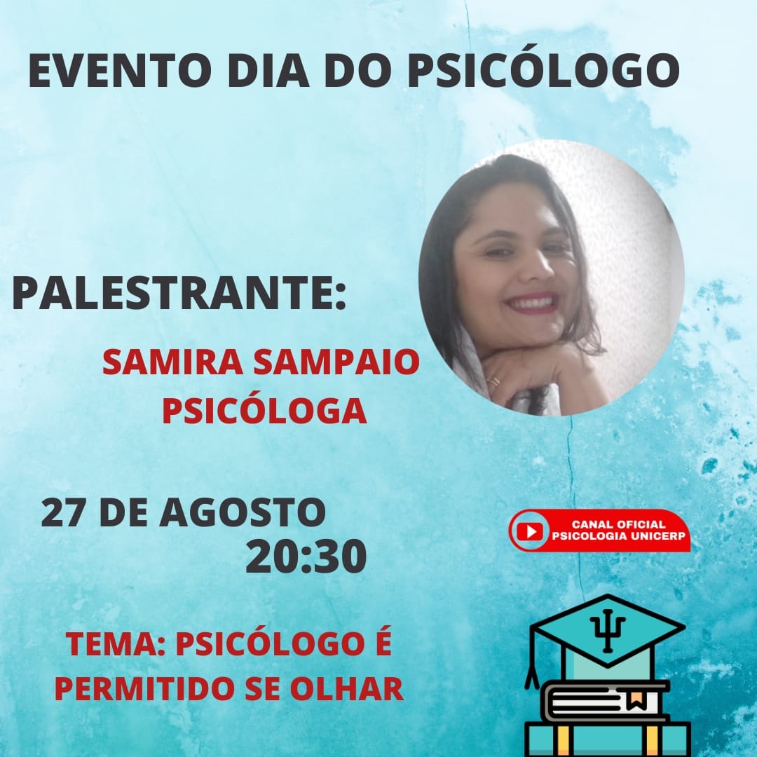 Para celebrar o Dia do Psicólogo, comemorado neste dia 27 de agosto, o curso de Psicologia do UNICERP promoverá um ciclo de palestras, abordando temas sobre Psicologia, Saúde e Clínica. Esse ano, o evento será em ambiente virtual, com as apresentações ao vivo disponibilizadas no canal oficial do curso.
