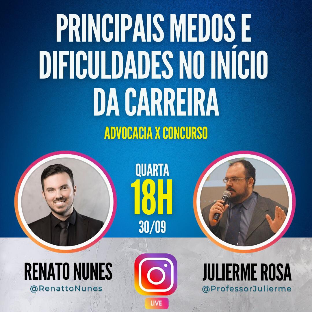 A live tratará sobre os principais empecilhos enfrentados no início da carreira, após a formação no curso de Direito, sob a perspectivas dos dois profissionais, a partir de vivências pessoais. Além disso, será abordado também a questão da preparação para os concursos públicos.