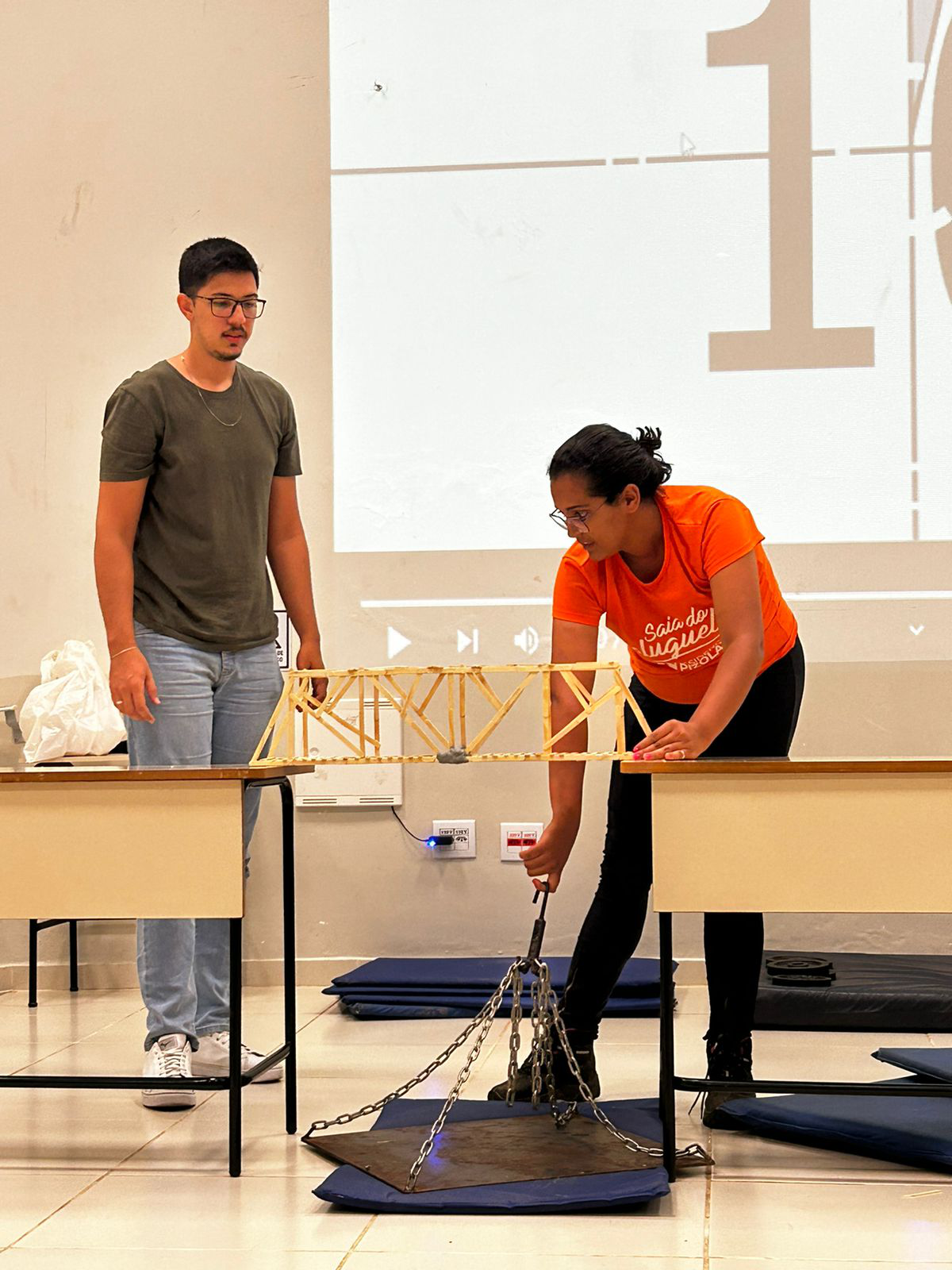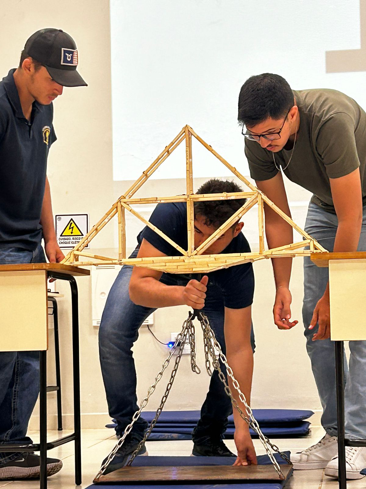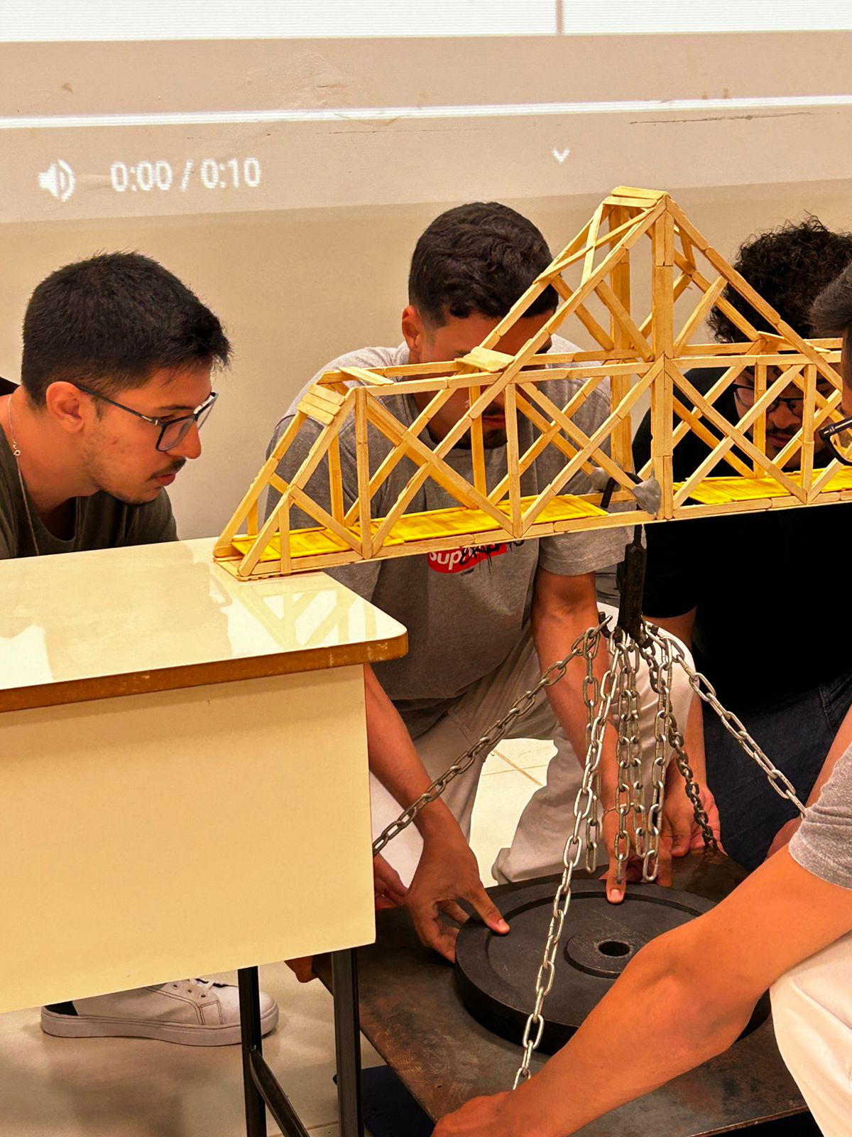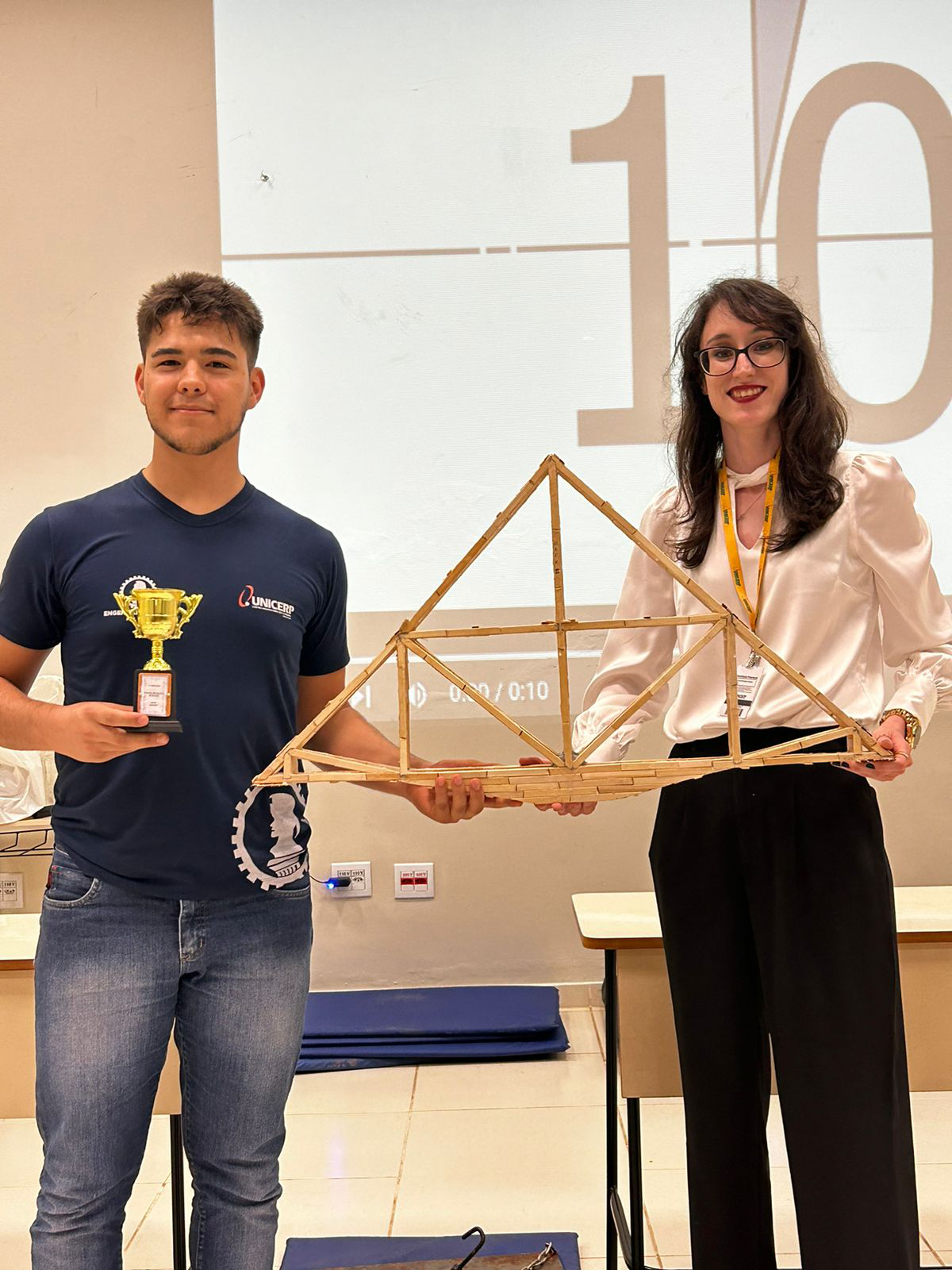 No dia em que se comemorou o Dia do Engenheiro Civil (25/10), os alunos do curso de Engenharia Civil do Unicerp participaram da 5ª Edição do Concurso de Pontes de Palito. A proposta foi a construção e o teste de carga de uma ponte treliçada, utilizando palitos de picolé e cola. A ponte construída pelos alunos precisava ter um vão livre de 80 cm e peso máximo de 750 g, sendo necessária a apresentação da estimativa da carga de colapso pelos participantes.