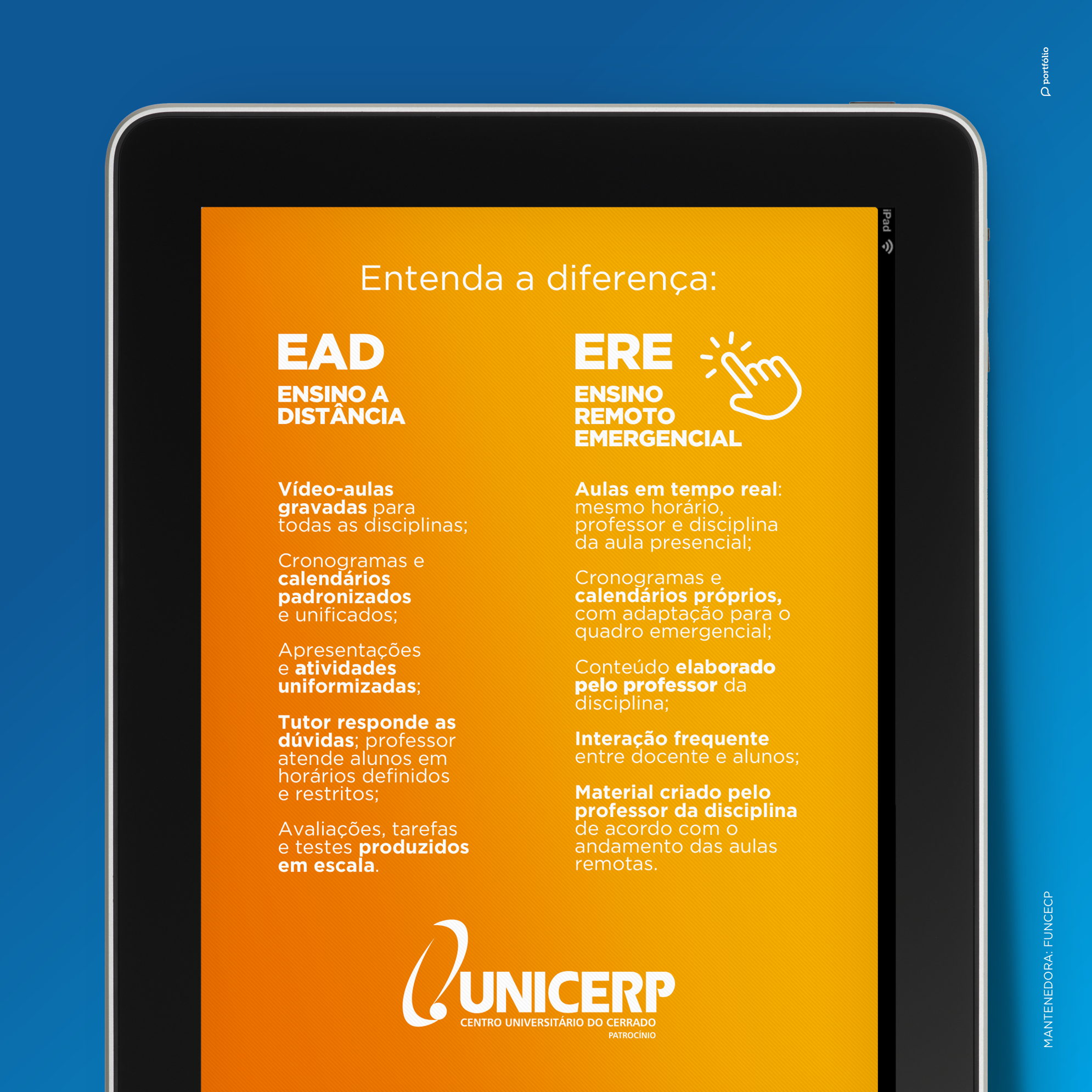 Nesse período de isolamento social, o UNICERP adotou o Ensino Remoto Emergencial para levar aos alunos, aulas em tempo real. Uma das maiores vantagens desse modo de ensino é que o aluno poderá interagir com o professor enquanto acontece a aula e terá as mesmas matérias que teriam presencialmente, no mesmo horário, algo que não ocorre no EAD.