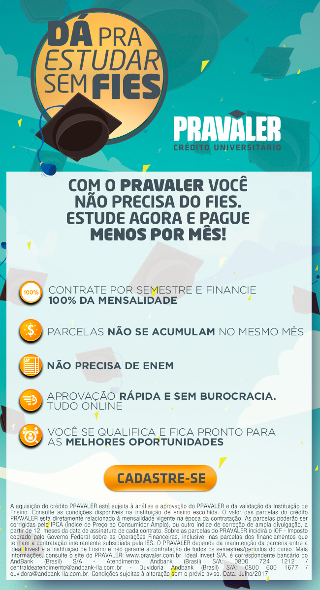 O PRAVALER é o maior programa de crédito universitário privado do país. Um financiamento exclusivo para ensino superior, oferecido em parceria com o UNICERP, que possibilita o pagamento das mensalidades de forma parcelada. Após aquisição, o PRAVALER quita o valor contratado do semestre para a Instituição de Ensino e o aluno realiza o pagamento das parcelas diretamente ao PRAVALER.