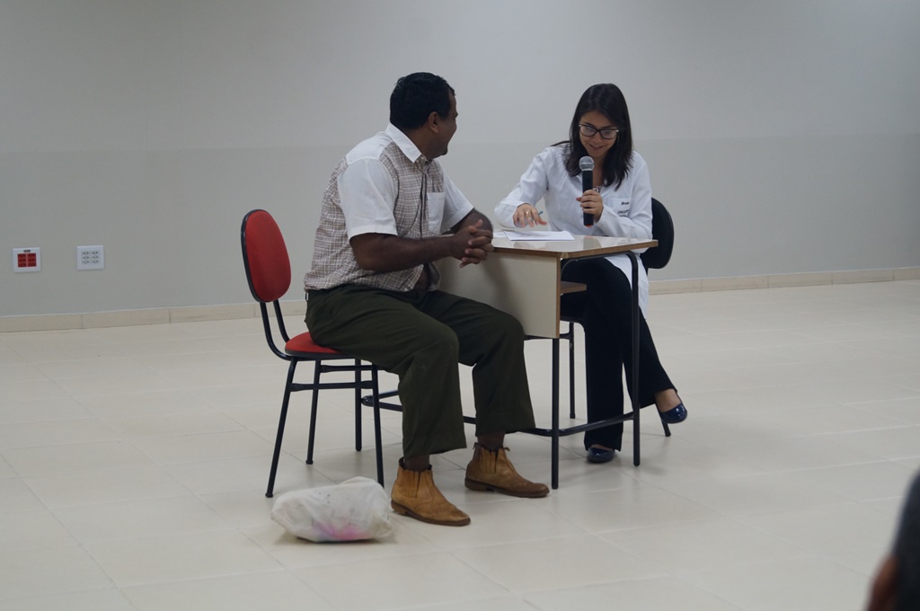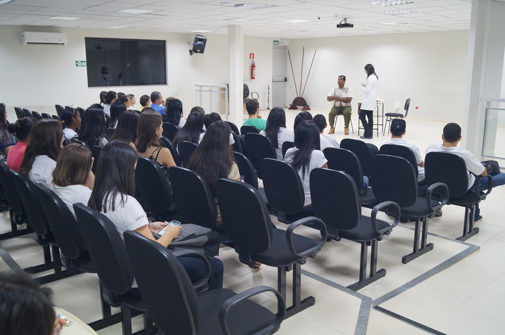 O encontro teve ainda esquete cômico com o ator Flávio Arvelos, interpretando o personagem Tibúrcio, e a aluna Bruna, além de dinâmica para que os estudantes pudessem se conhecer melhor, orientados pelas veteranas Amanda e Andreia.
