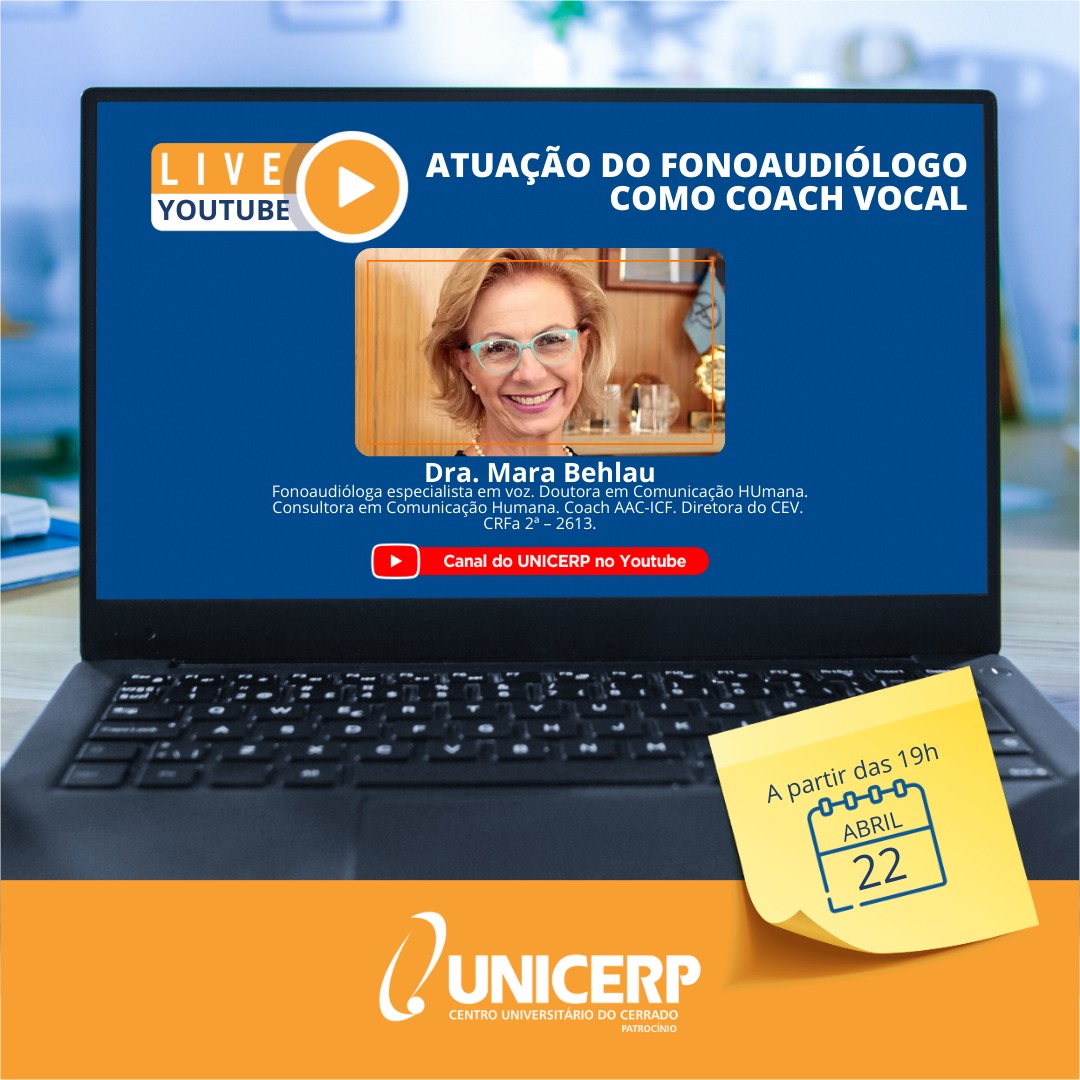 Nesta quinta-feira, dia 22 de abril, a partir das 19h, o curso de Fonoaudiologia do UNICERP realizará live sobe o tema “Atuação do Fonoaudiólogo como Coach Cocal”