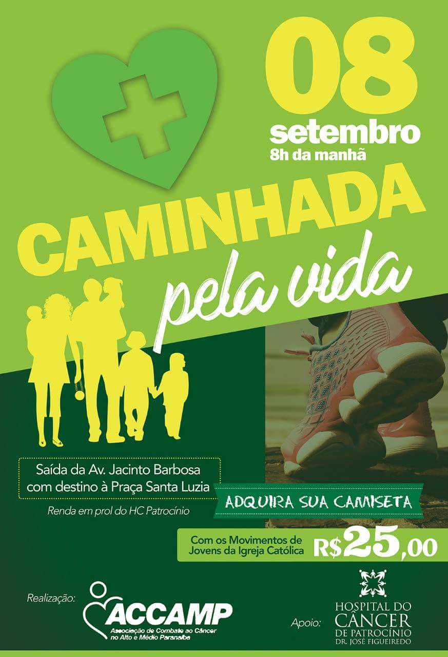 A Caminhada pela Vida do HC de Patrocínio acontecerá em 8 de setembro, a partir das 8h. O trajeto será do cruzamento das avenidas Rui Barbosa e Jacinto Barbosa (próximo ao viaduto), chegando até a Praça Santa Luzia. Os participantes devem adquirir a camiseta da caminhada com os movimentos de jovens da Igreja Católica.