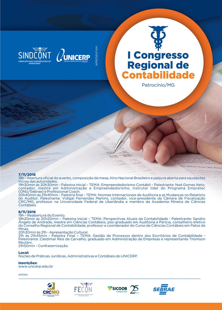 O UNICERP e o Sindicato dos Contabilistas de Patrocínio realizarão nos dias 7 e 8 de novembro o I Congresso Regional de Contabilidade de Patrocínio/MG. O evento acontecerá no Núcleo de Práticas Jurídicas, Administrativas e Contábeis do Centro Universitário do Cerrado Patrocínio.