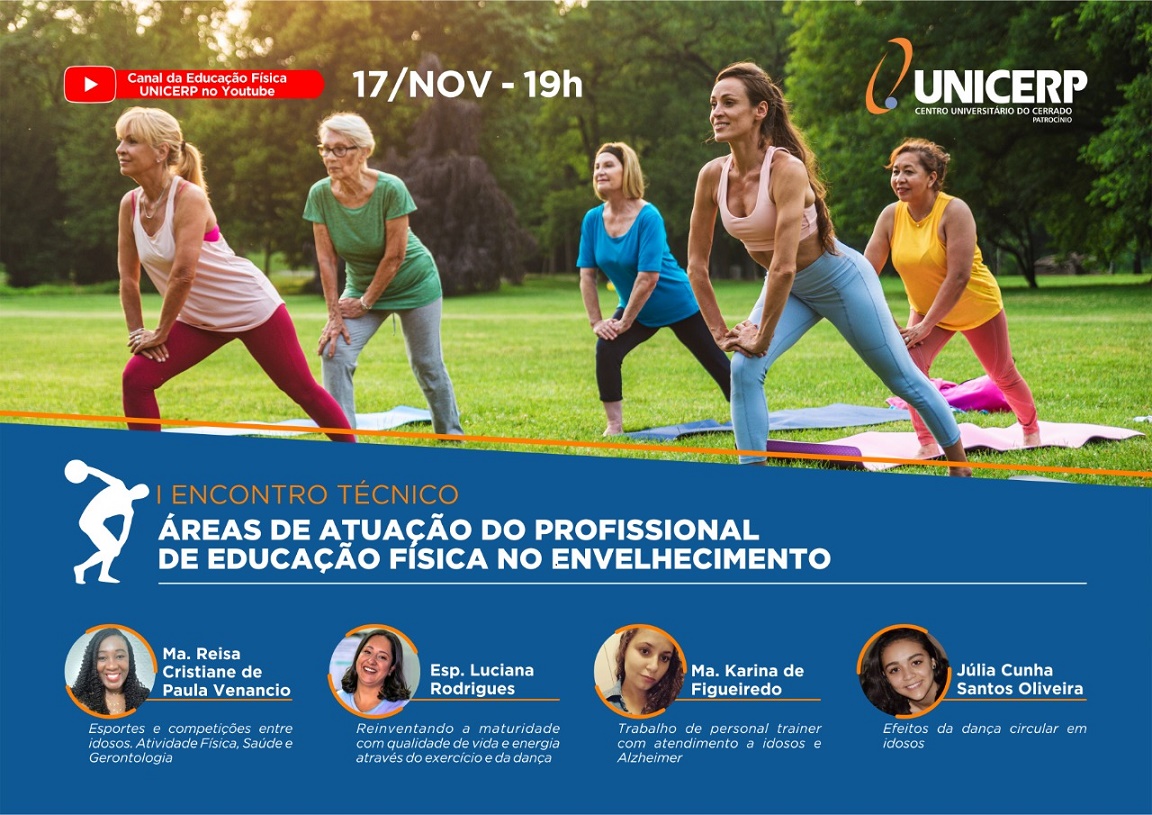O curso de Educação Física do UNICERP realizará no dia 17/11/2021, às 19h, o I Encontro técnico: Áreas de Atuação do Profissional de Educação Física no Envelhecimento. O evento será on-line e transmitido pelo Canal Oficial da Educação Física – UNICERP.