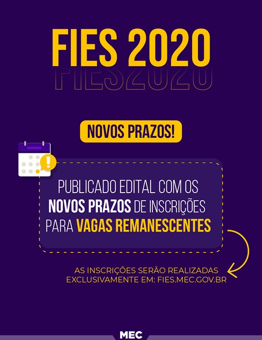 O Ministério da Educação (MEC) divulgou os novos prazos de inscrições para cerca de 50 mil vagas remanescentes do Fundo de Financiamento Estudantil (Fies), referentes ao 2º semestre de 2020. As vagas remanescentes são aquelas não preenchidas nas edições de 2020 dos processos seletivos regulares do Fies.
