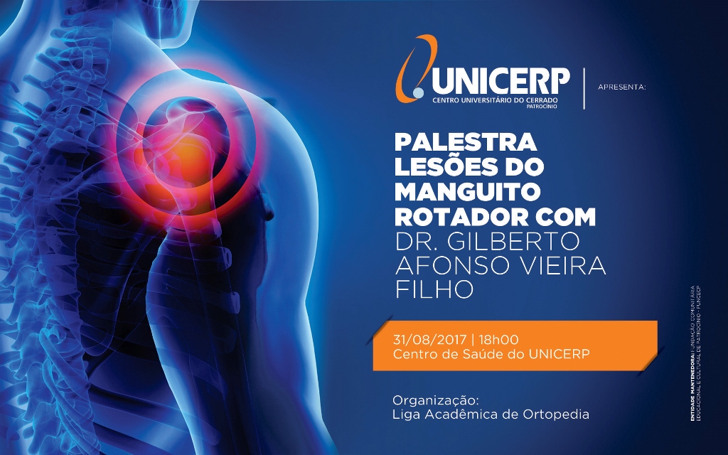 No dia 31 de agosto o Centro Universitário do Cerrado Patrocínio oferecerá a palestra "Lesões do Manguito Rotador", ministrada pelo médico ortopedista Gilberto Afonso Vieira Filho. A apresentação acontecerá a partir das 18h, no Centro de Saúde do UNICERP. A realização é da Liga Acadêmica de Ortopedia.
