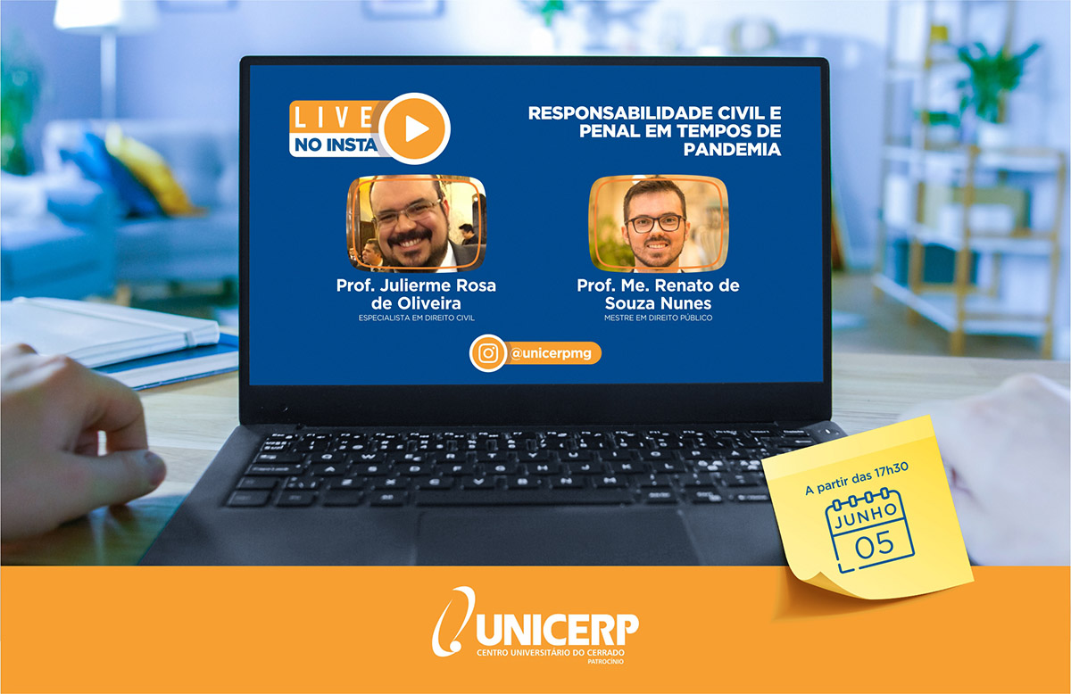 "Responsabilidade civil e penal em tempos de pandemia” será o tema da #livenoinsta que irá acontecer no Instagram do UNICERP – sigam @unicerpmg – no dia 05 de junho, sexta-feira, a partir das 17h30. O bate papo será com os professores do curso de Direito do UNICERP, Me. Renato de Souza Nunes e Esp. Julierme Rosa de Oliveira.