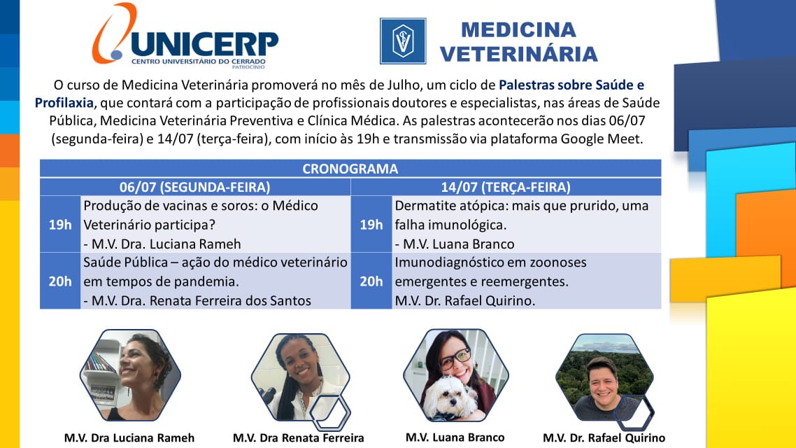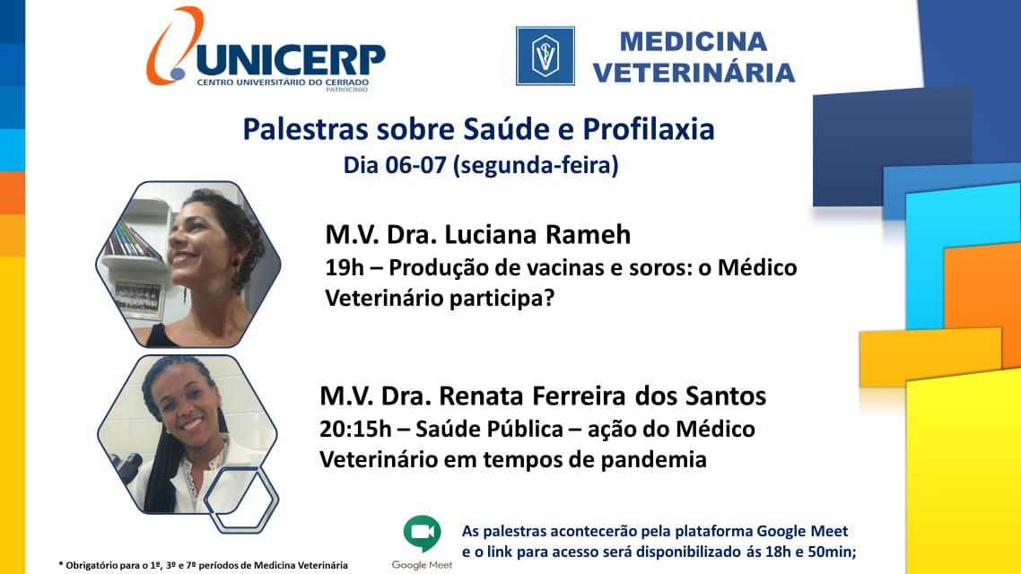 20h: “Saúde Pública – ação do médico veterinário em tempos de pandemia”, com a M.V. Dra. Renata Ferreira dos Santos