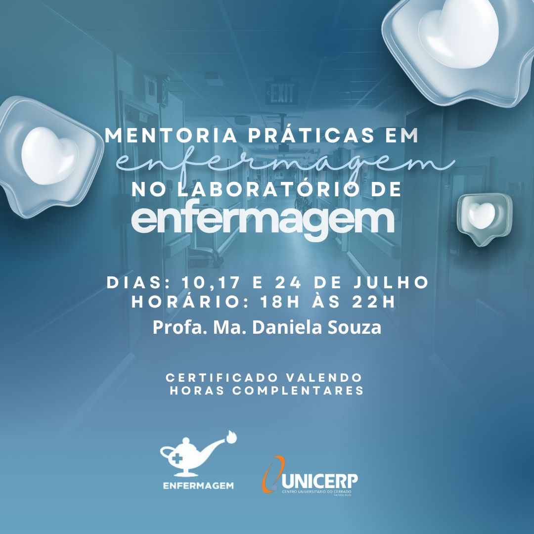 O curso de Enfermagem do UNICERP promoverá, nos dias 10, 17 e 24 de julho, a Mentoria Práticas em Enfermagem, um momento especial de aprofundamento e aplicação prática de conhecimentos no laboratório de Enfermagem da instituição.