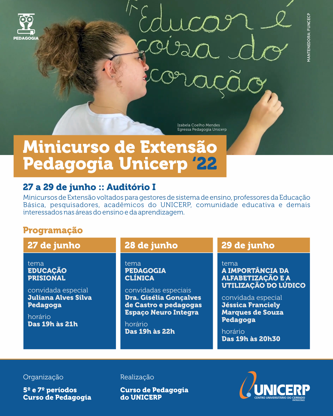 O curso de Pedagogia do UNICERP realiza a partir de hoje, 27 de junho, mais uma edição de Minicursos de Extensão. A programação acontece no Auditório I do campus universitário e vai até o dia 29, quarta-feira, sempre com início às 19h.