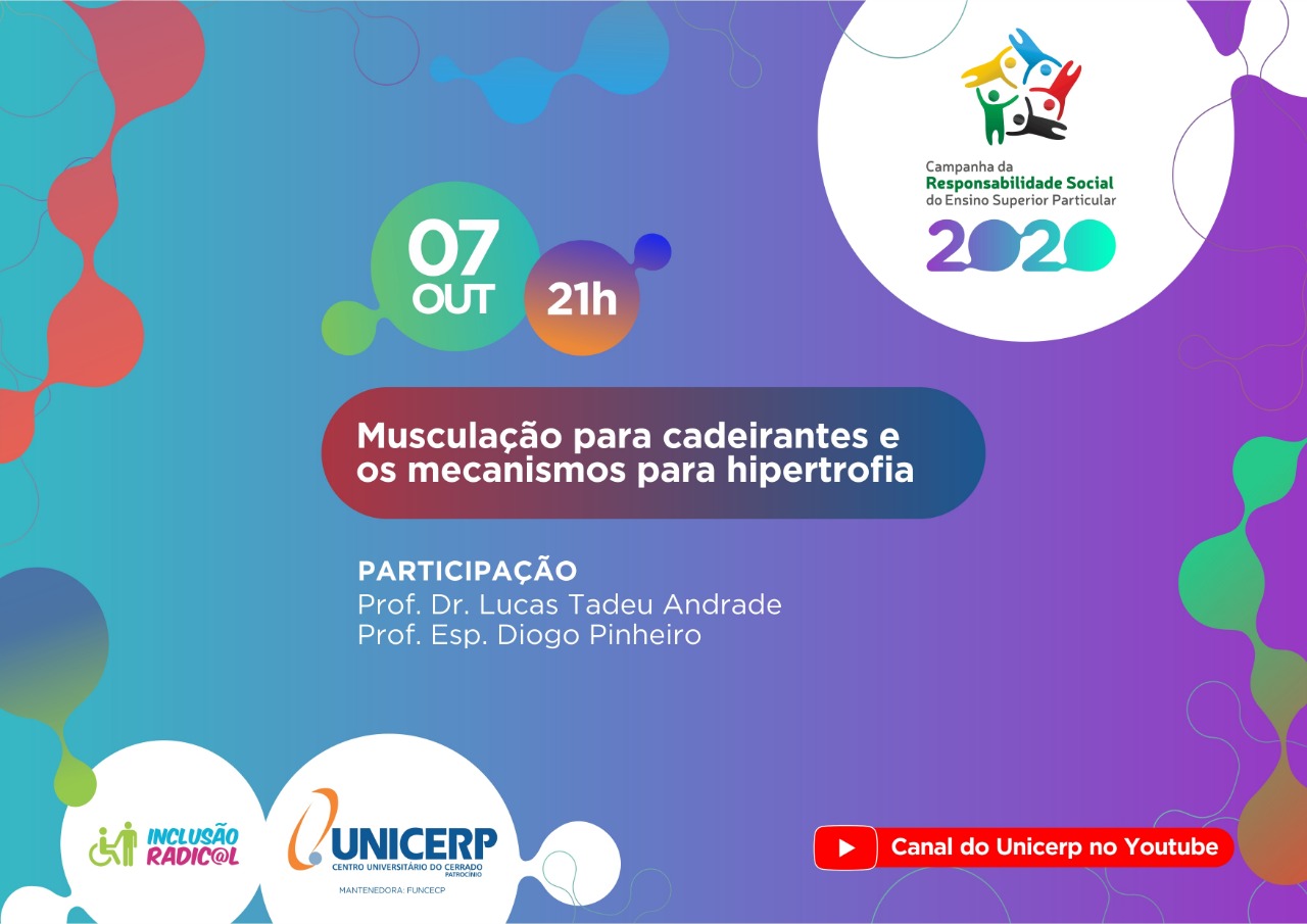 Seguindo com a Campanha de Responsabilidade Social 2020, o UNICERP, em parceria com a Associação Inclusão Radical, promove mais uma transmissão nesse dia 7 de outubro. O tema será “Musculação para cadeirantes e mecanismos para hipertrofia”, com participação do Prof. Dr. Lucas Tadeu Andrade, do Prof. Esp. Diogo Pinheiro e da Kallyna Sampaio, membro da associação.