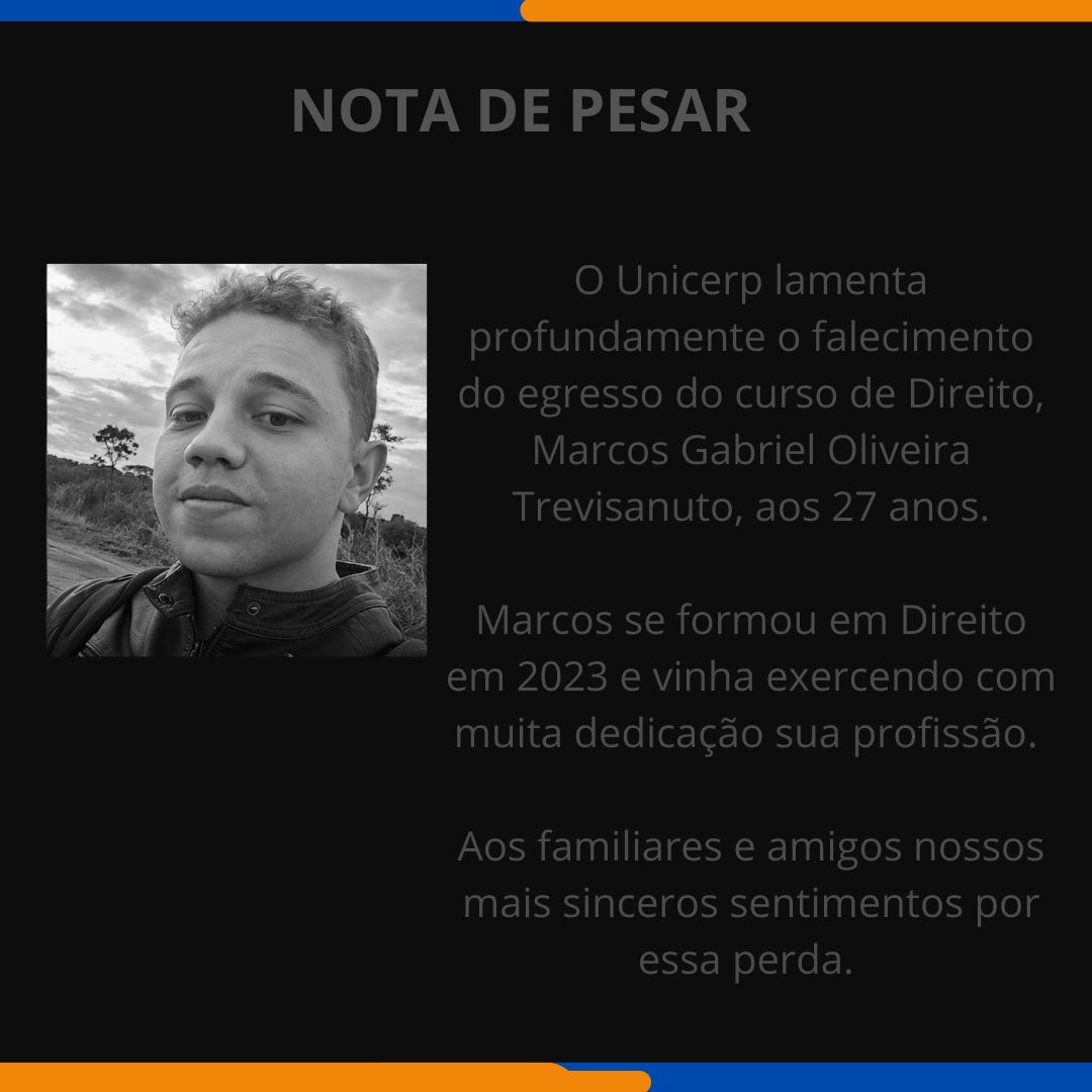 O Unicerp lamenta profundamente o falecimento do seu egresso do curso de Direito, Marcos Gabriel Oliveira Trevisanuto, aos 27 anos.