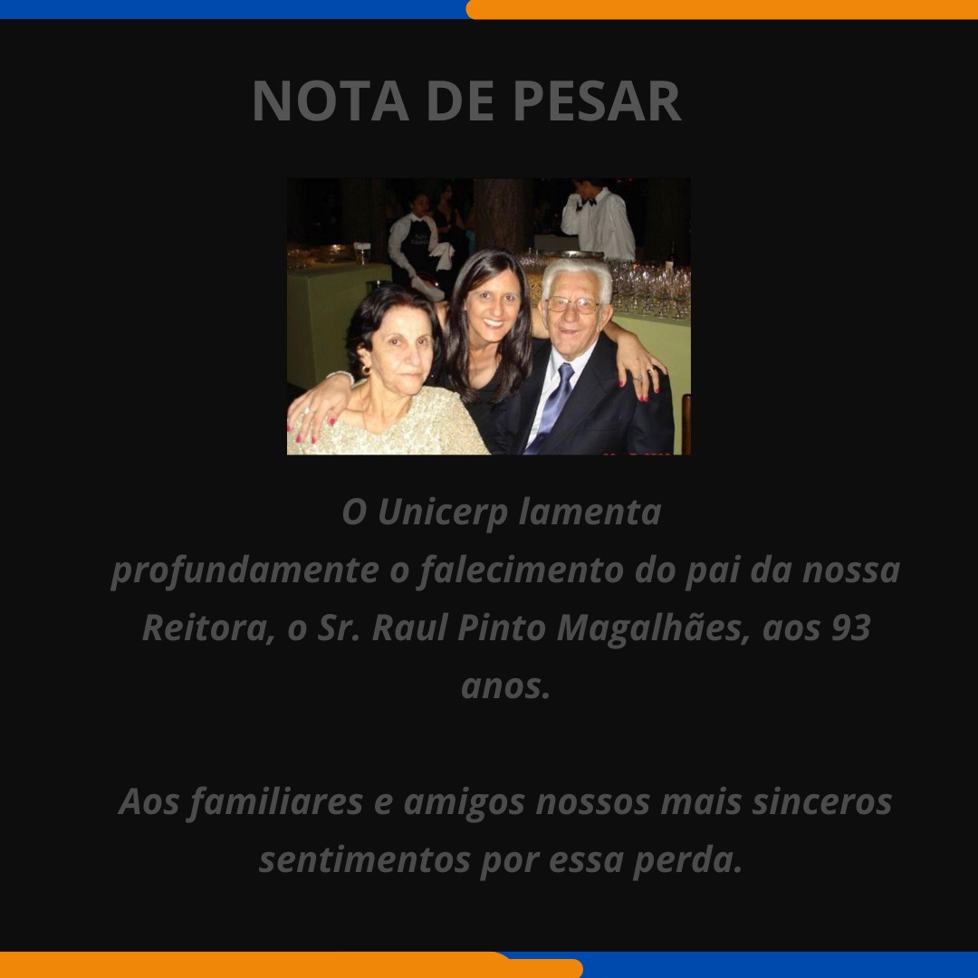 A FUNCECP e suas mantidas – UNICERP e EASFP – estão em luto pelo falecimento do pai da nossa Reitora, Sr. Raul Pinto Magalhães, aos 93 anos.