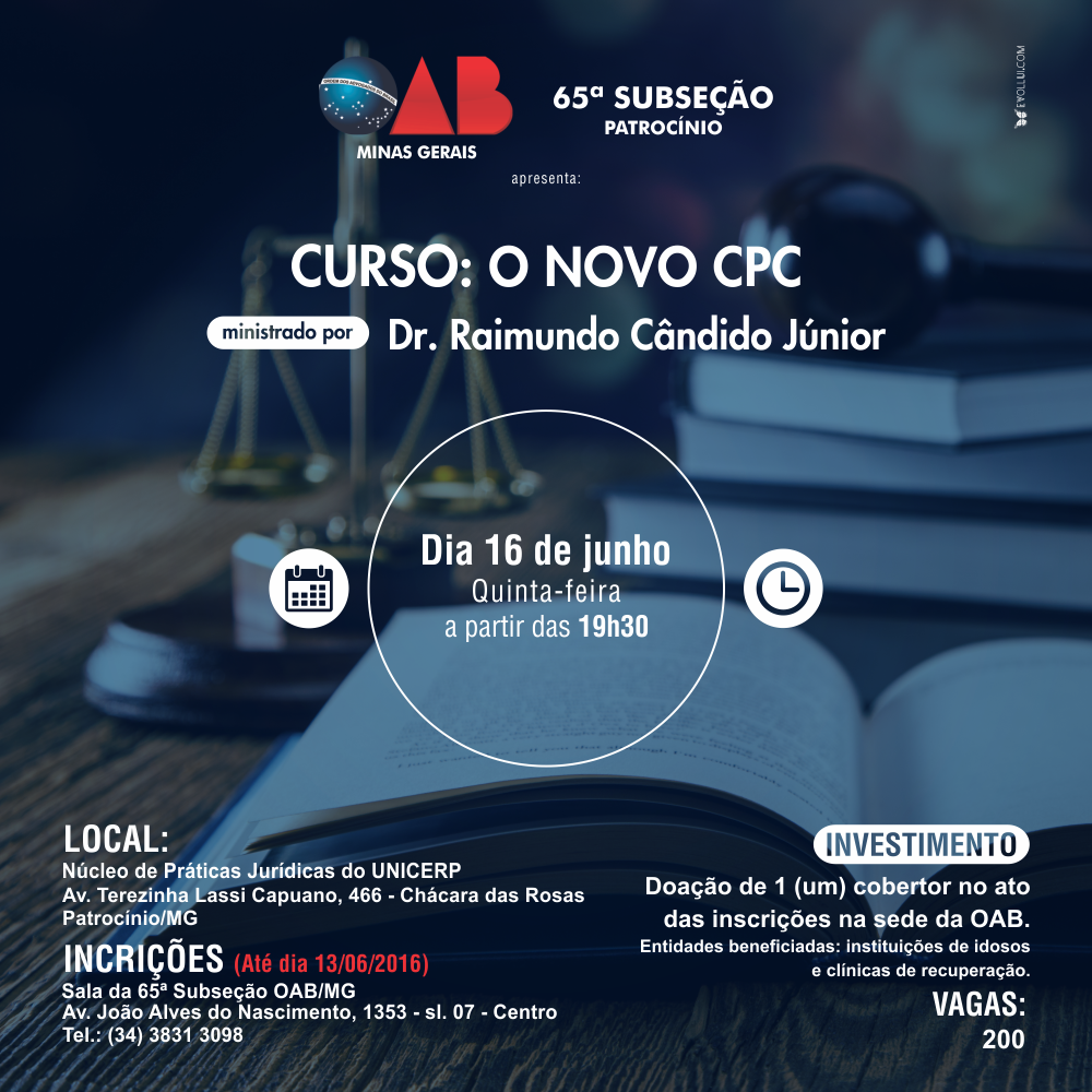 O UNICERP receberá no dia 16 de junho, quinta-feira, às 19h30, o curso "O novo CPC", ministrado pelo Dr. Raimundo Cândido Júnior. O evento acontecerá no Núcleo de Práticas Jurídicas, Administrativas e Contábeis do Centro Universitário do Cerrado Patrocínio.