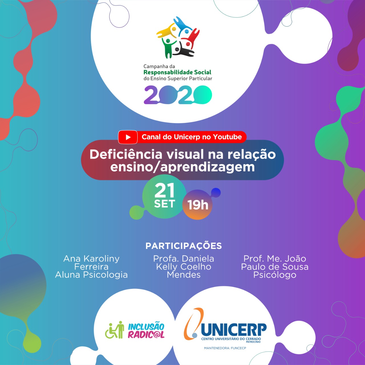 Acompanhe a palestra “Deficiência visual na relação ensino/aprendizagem”. A apresentação faz parte da Campanha de Responsabilidade Social de 2020, cujo tema é a Inclusão das Pessoas com Deficiência.